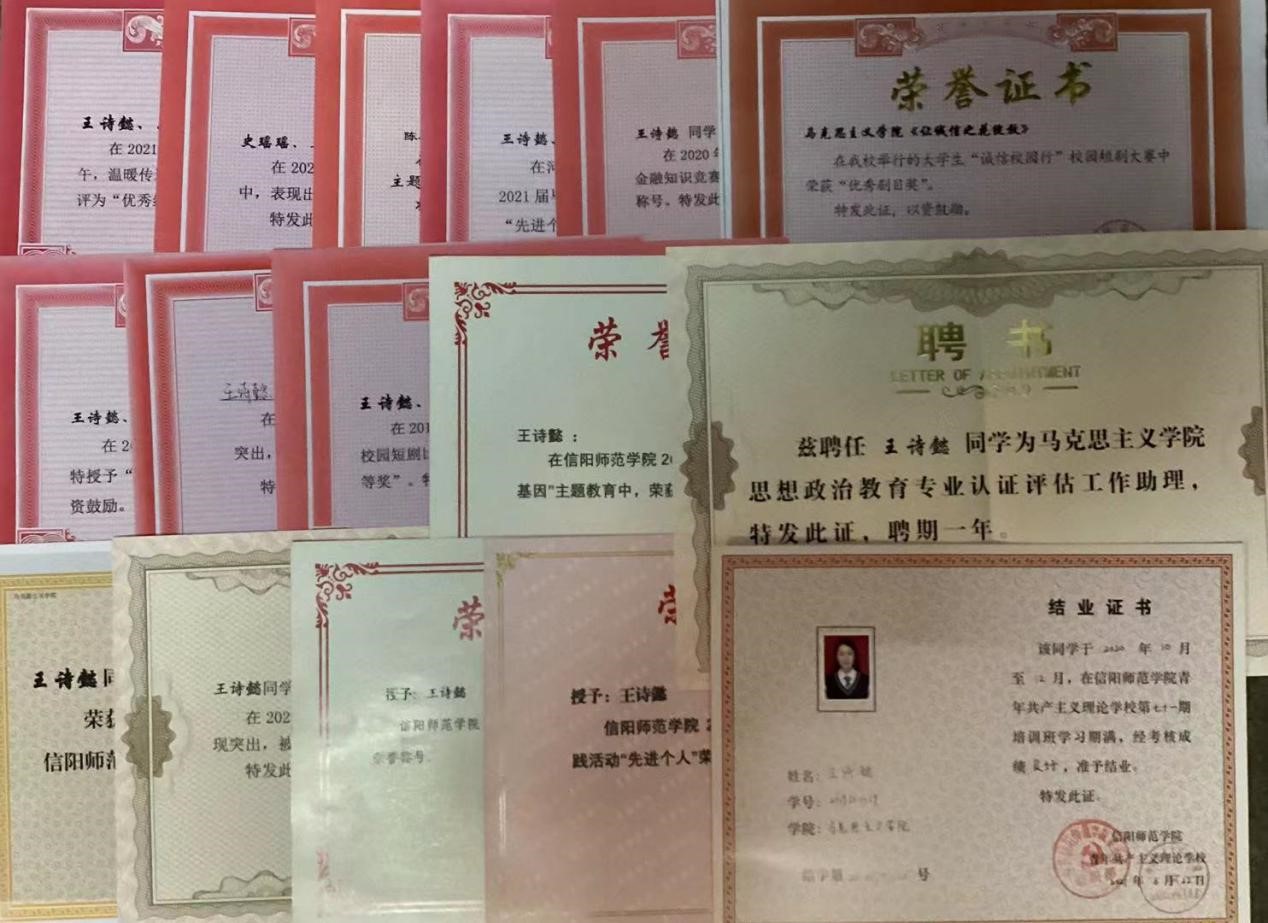 在学习方面,该生勤奋刻苦,善于思考,坚持练就过硬本领,努力提高科学文化水平,时刻把学习当作自己的第一任务,积极投入到各门基础课和专业课的学习中,并不断提高自身写作能力,积极撰写《在抗疫中书写奋斗青春》、《以高尚人格增添思政课教师魅力》等文章,并在《南湖评论》上发表。2019-2020学年荣获校级三等奖学金,顺利通过英语四级考试、普通话水平测试。不仅注重专业知识学习,而且注重提升综合能力,积极参加广播体操比赛、微团课比赛、南湖理论研讨社主题征文活动、学生会夜跑活动、“丹青墨韵”摄影美术作品大赛、仁杰工作室笔锋征文活动,参演了新生联谊晚会和2020年元旦晚会。2019年,参加学院“诚信校园行”校园短剧比赛中,荣获一等奖;2020年,参加法学与社会学学院手帐比赛获得二等奖;参加计算机学院“疫中成长分享你我的故事”比赛中获得手账组二等奖;参加德赢AC米兰官网“诚信伴我行”线上金融征信知识竞赛获得二等奖;2021年,参加信阳师范学院“拼贴手账,我手秀我型”活动,荣获“三等奖”;参加“莘莘学子学四史,同心向党迎华诞”主题活动,被评为“优秀工作者”;被评为信阳师范学院2021年度三好学生。
