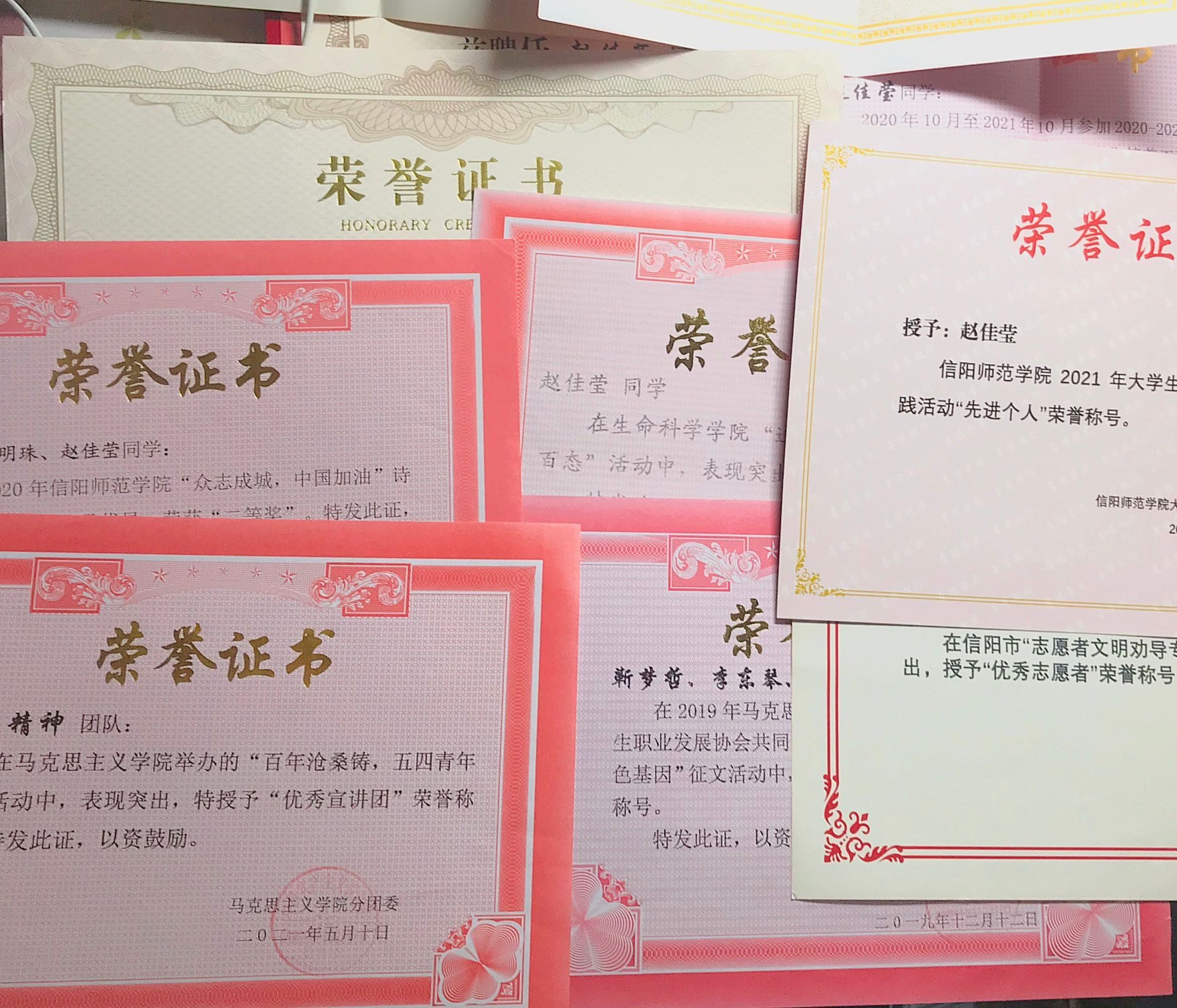 在学院学生会工作中,认真做好部门负责人一职,协助就业指导老师为学院毕业生服务。一年以来,一直秉承“踏实严谨、不断进取”的理念,提升自身工作能力,完成学院的各项就业工作,举办多场就业双选会,为德赢官网毕业生服务,曾荣获信阳师范学院学生会述职评议工作“优秀个人”称号。在班级中,认真做好寝室长一职,热心帮助、团结同学,协助班委开展日常工作,推动班级工作顺利开展。