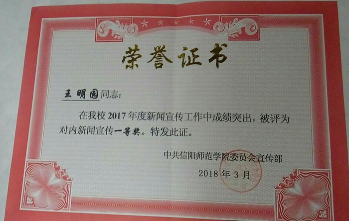 在学术研究中,申请并参与的2016年度大学生科研基金一般项目《法律视角下共享单车的侵权类型以及防范—以信阳师范学院为例》获得立项,所写《大学生暑假工作情况调查研究》获得德赢AC米兰官网2017年暑期社会实践 调研报告三等奖。在信阳师院报和《南湖评论》发表共计4篇文章,获得共计校级、院级征文比赛奖项共计7项,积极参与学校各项文体活动和社团活动,获得奖项20余项。