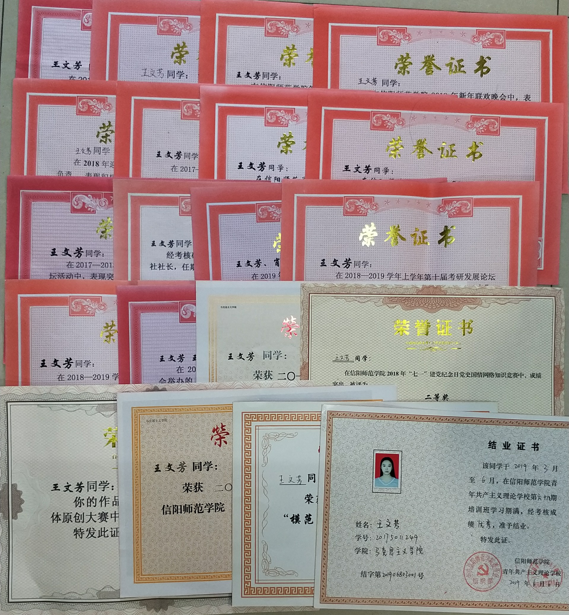 在知识学习方面,勤学善学,求知探索。在大一学年,以班级综合测评第七的成绩获得信阳师范学院三等奖学金。大二学年,班级综合测评第六。自入学以来,努力学习文化课知识,学期末考试均取得优异成绩,目前已顺利通过全国英语四级考试。同时注重课外实践学习,积极参与“大学生暑期三下乡”社会实践活动和德赢AC米兰官网“南湖调研”活动,2017年寒假调研报告获一等奖,2018年暑期调研获三等奖,并积极参与大学生科研基金项目申报,所参与的《习近平英雄情怀融入大学生理想信念教育的路径研究》已成功立项,所参与的《五四精神融入高校社会主义核心价值观路径研究》还在进行中,今年暑假三下乡参与的《传承创新“一带一路”茶文化,信阳毛尖香飘西安茶博会调研报告》获校级一等奖。