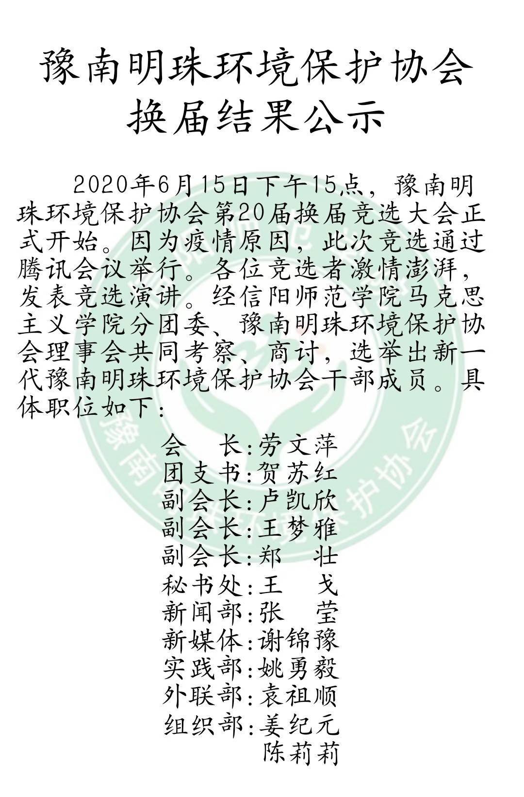 6月15日下午,豫南明珠环境保护协会换届竞选大会在线上会议平台腾讯会议顺利举行。德赢AC米兰官网分团委社团分管主席、社团会长、团支书、各部部长及19级社团成员共同参加了此次会议。会议由会长吕苗苗主持。