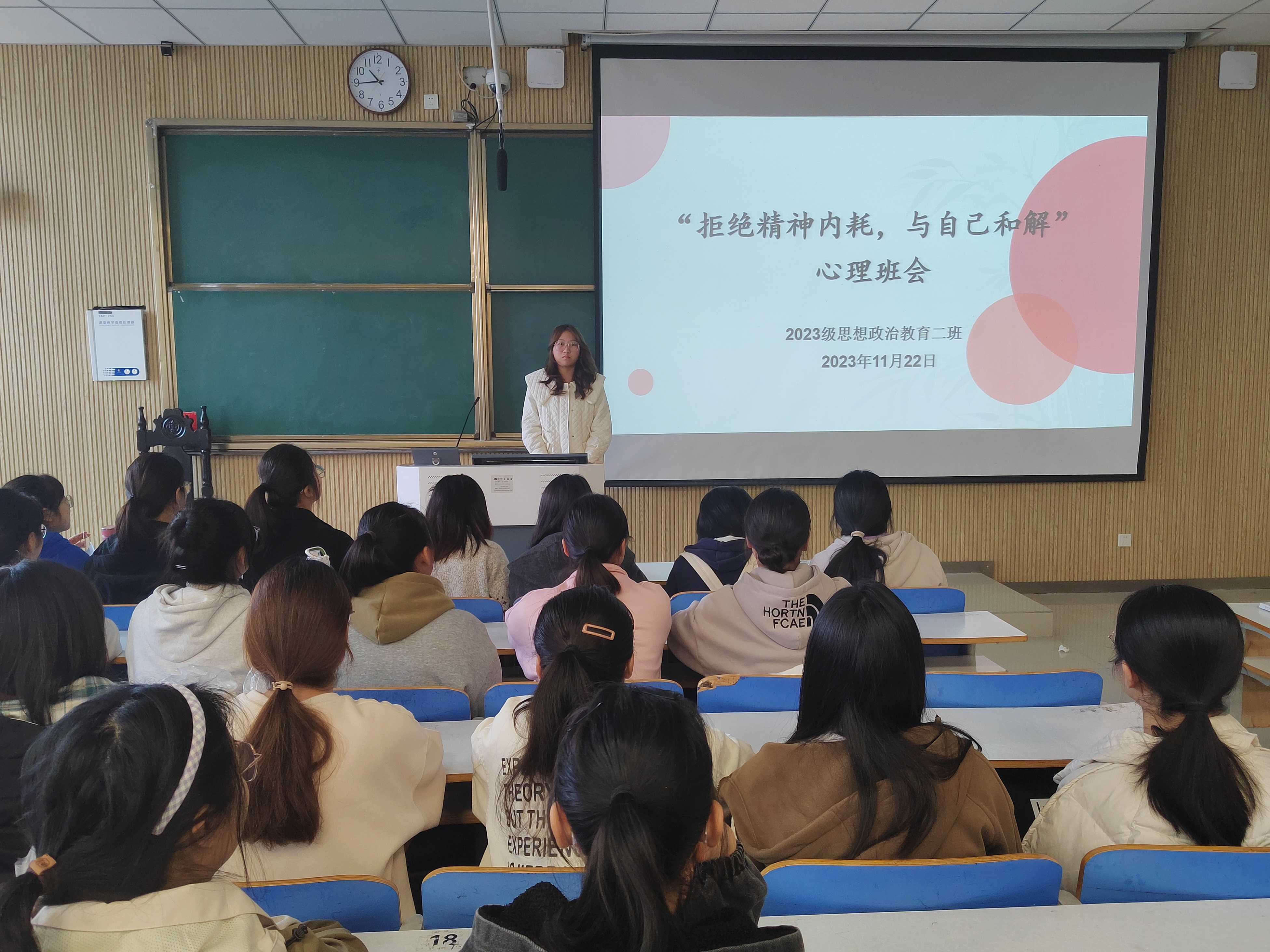 为促进学生心理健康,建立良好的班级氛围,11月22日下午,德赢AC米兰官网2023级思想政治教育二班在社科楼515教室召开“拒绝精神内耗,与自己和解”心理班会。本次心理班会由心理委员李羽欣主持,二班全体同学共同参加。