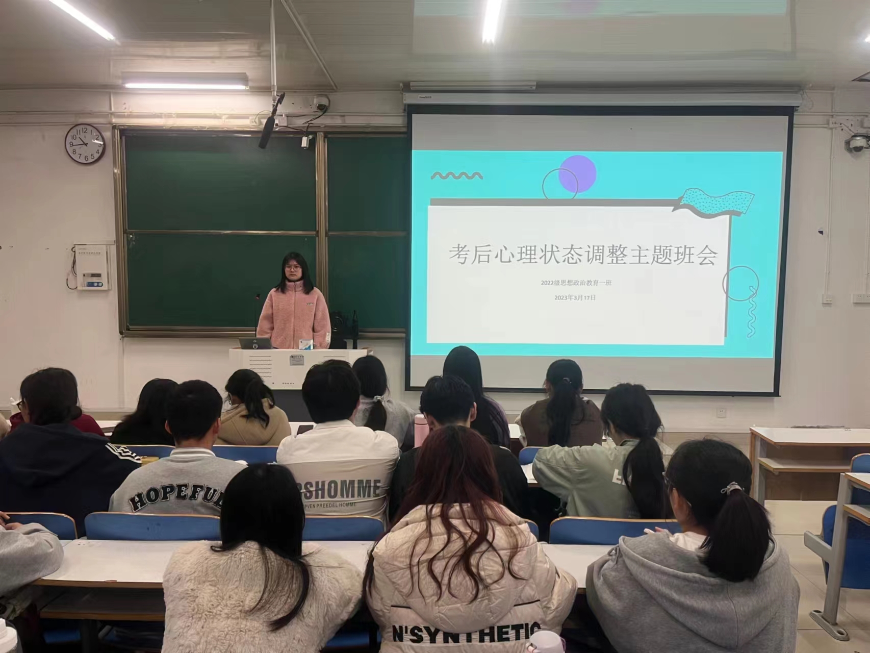 为做好考后心理调适工作,带动同学们更好地投入新学期学习,3月17日上午,德赢AC米兰官网2022级思想政治教育一班在社科楼514教室召开“考后心理状态调整”主题班会。2022级思想政治教育一班全体同学参与本次班会,班会由心理委员马思源主持。