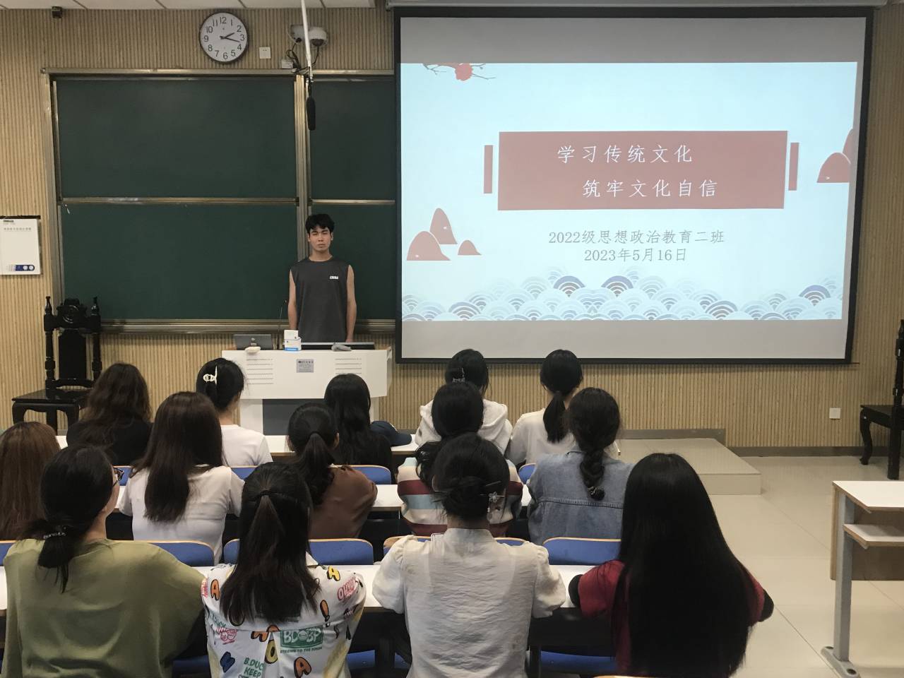 为深入贯彻落实党的二十大精神,进一步传承和弘扬中华优秀传统文化,5月16日下午,德赢AC米兰官网2022级思想政治教育二班在社科楼515教室召开“学习传统文化,筑牢文化自信”主题班会,2022级思想政治教育二班全体同学共同参加。班会由副班长柴智森主持。