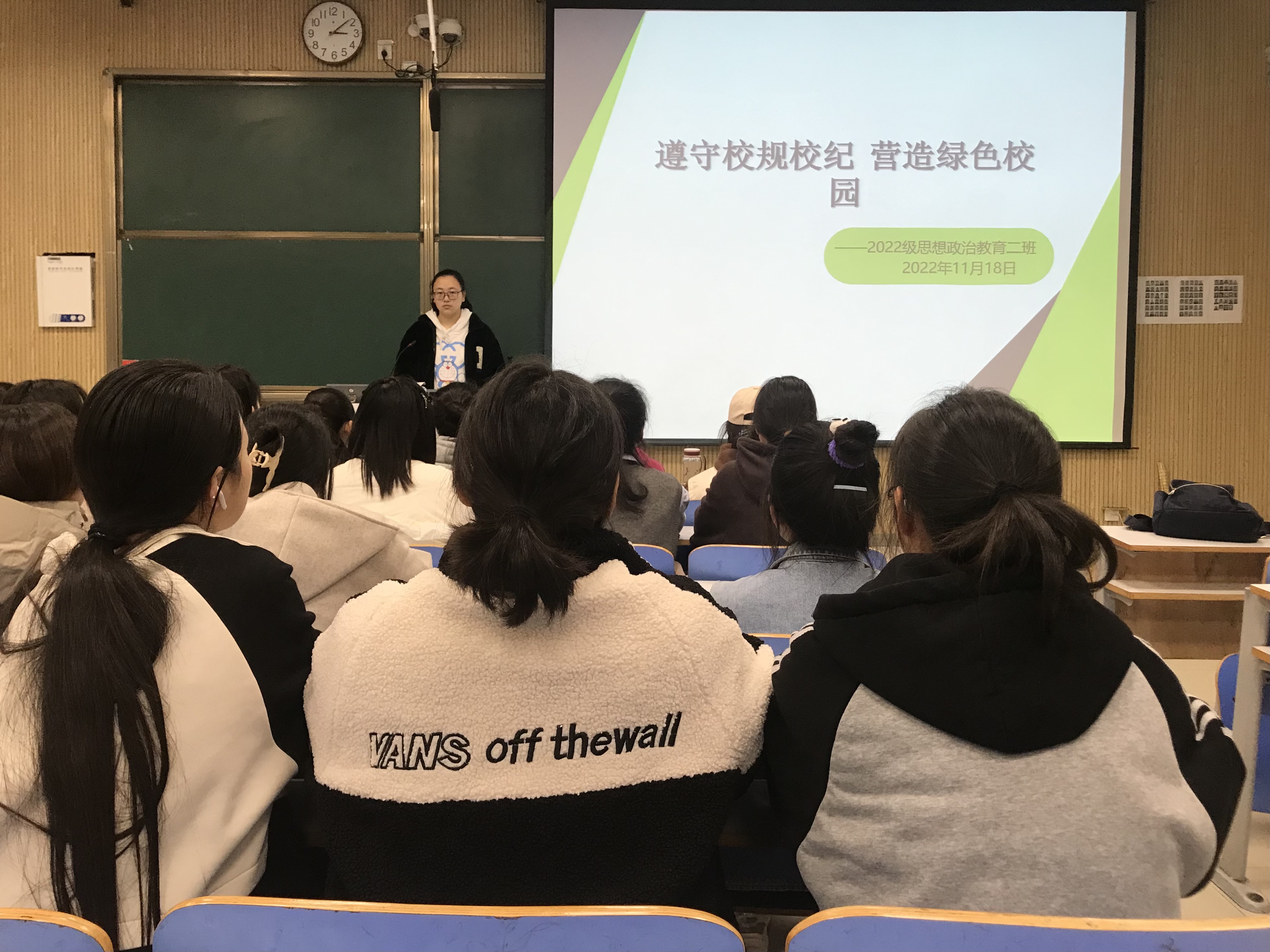 11月18日下午,德赢AC米兰官网2022级思想政治教育二班在社科楼515教室召开“遵守校规校纪 营造绿色校园”主题班会。2022级思想政治教育二班全体同学共同参加会议。本次会议由班长李佳音主持。