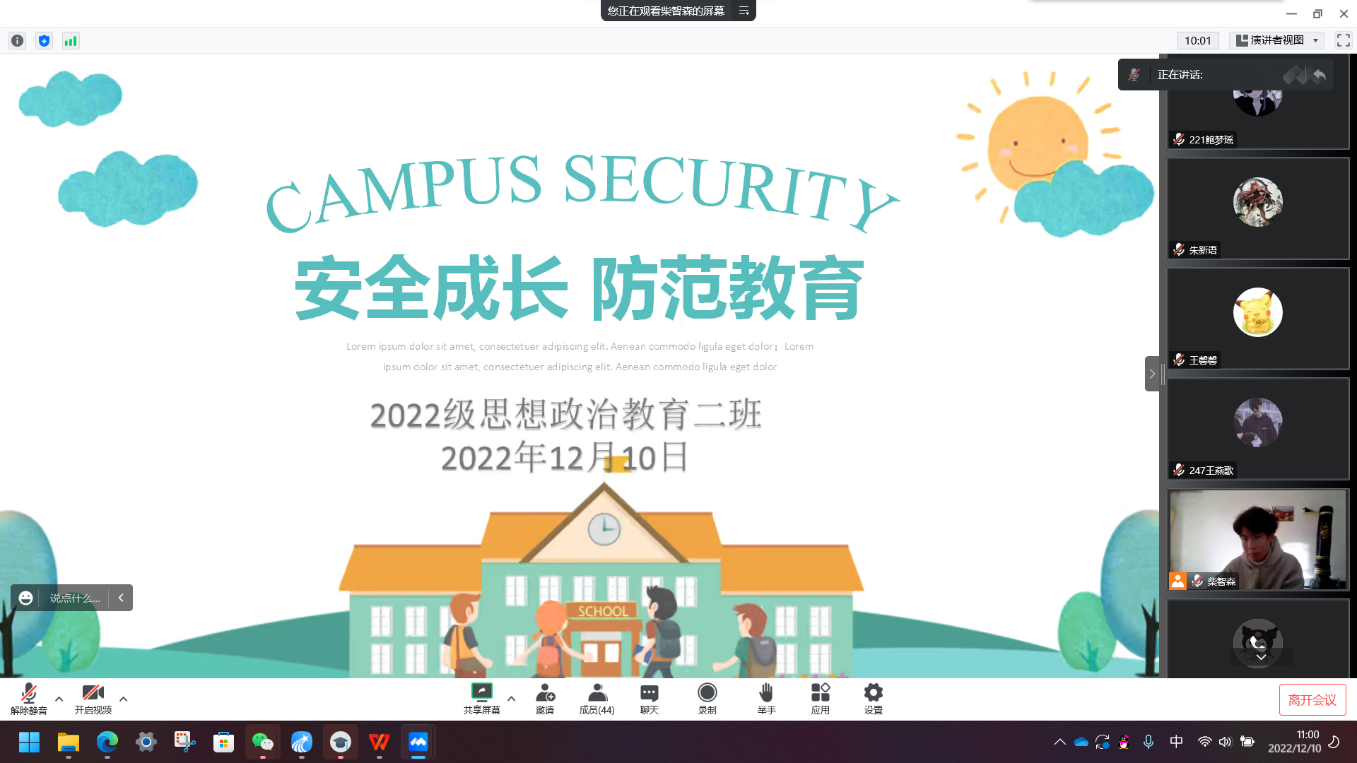为切实加强安全教育,提高学生假期安全防范意识和自我防护意识,12月10日上午,德赢AC米兰官网2022级思想政治教育二班于线上召开“安全成长 防范教育”主题班会。2022级思想政治教育二班全体同学共同参加会议。本次会议由副班长柴智森主持。