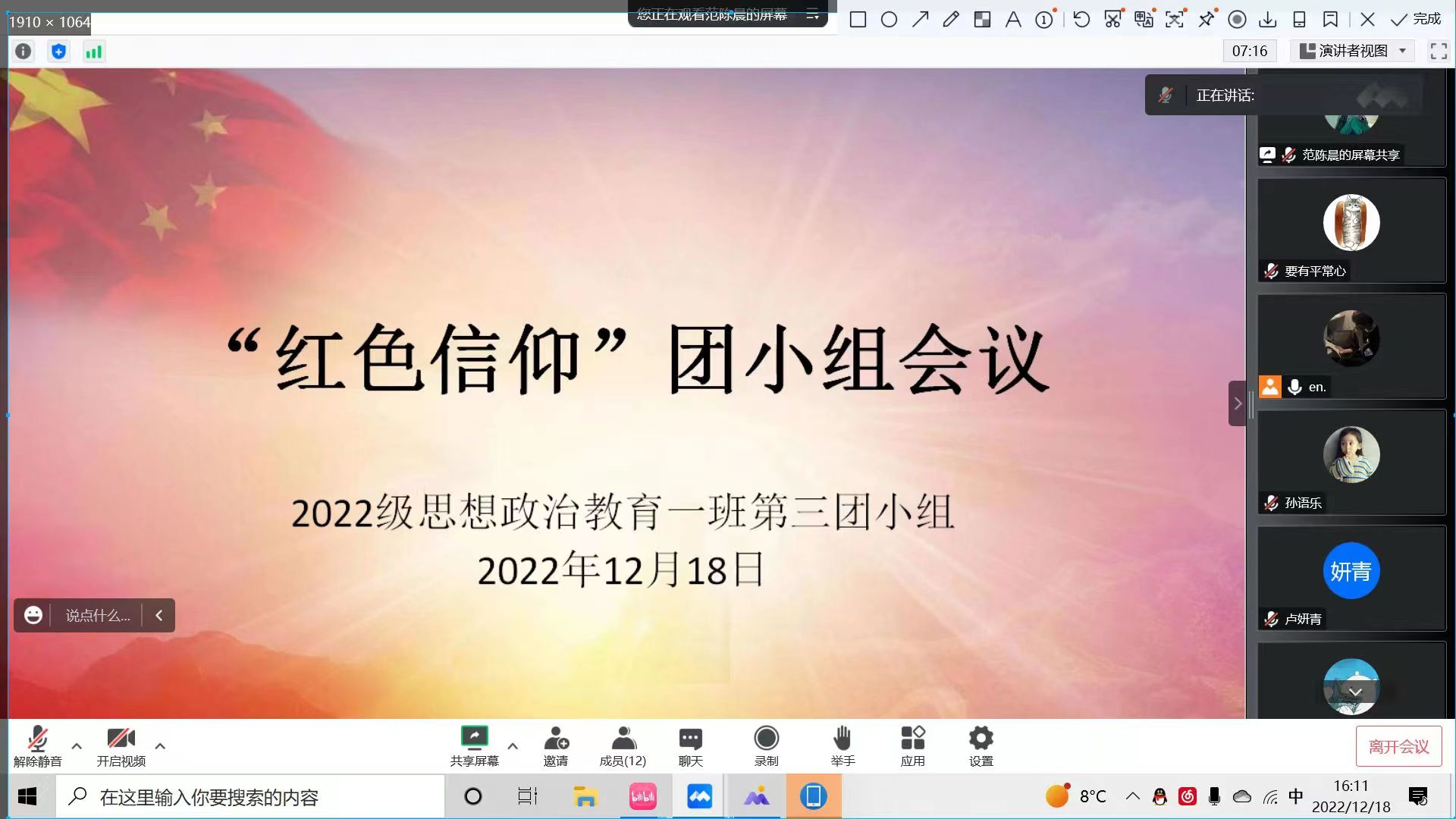 为加强团员党的理论学习,坚定红色信仰,12月18日下午,德赢AC米兰官网2022级思想政治教育一班团员在线上召开“红色信仰”团小组会议。2022级思想政治教育一班团员参与本次会议,会议由团支部副书记闻炎仲主持。