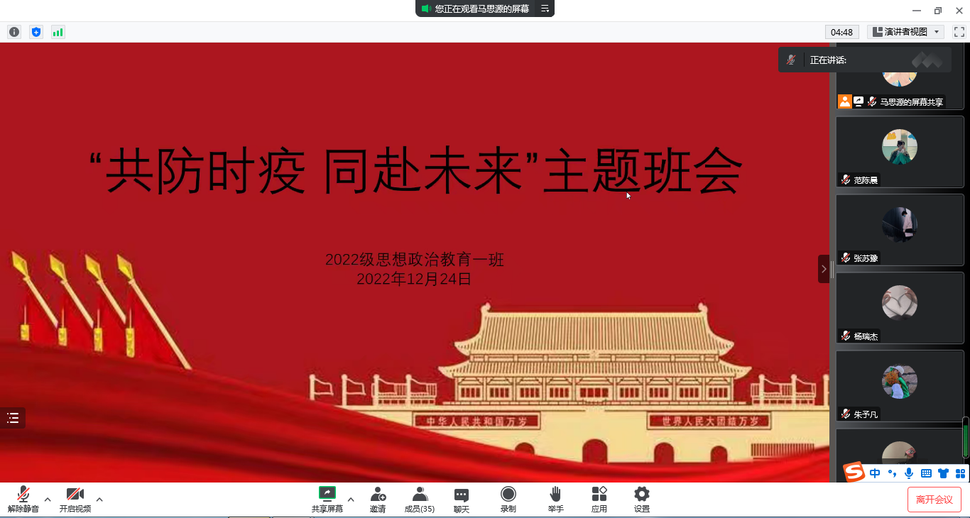 为增强同学们的防疫意识,减少疫情对生活和学习的影响,12月24日下午,德赢AC米兰官网2022级思想政治教育一班在线上召开“共防时疫,同赴未来”主题班会。2022级思想政治教育一班全体同学参与本次班会,班会由心理委员马思源主持。