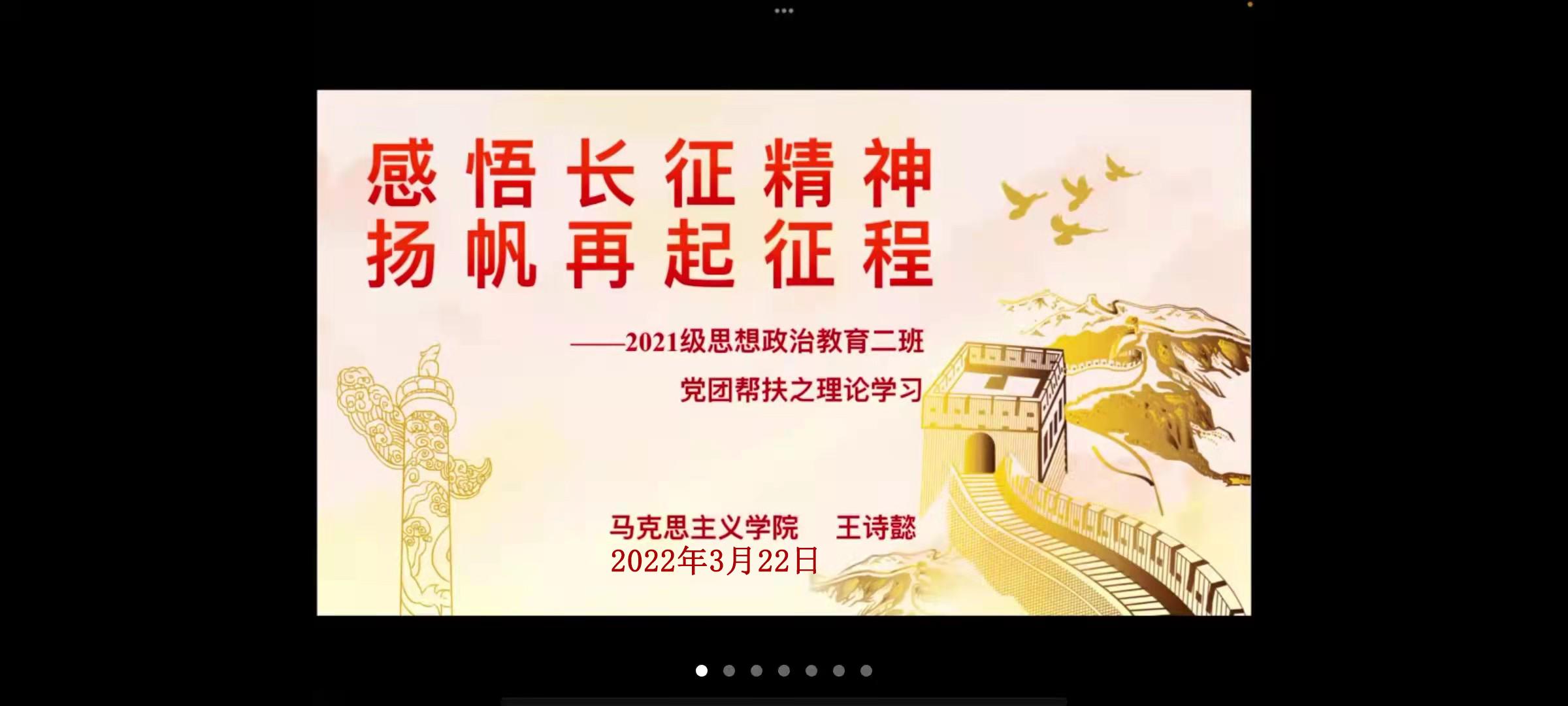 3月22日下午,德赢AC米兰官网2021级思想政治教育二班在腾讯会议举办“感悟长征精神,扬帆再起征程”党团帮扶之理论学习活动。2019级思想政治教育一班预备党员王诗懿、赵佳莹以及2021级思想政治教育二班全体团员参与此次活动,活动由团支书王婧欣主持。
