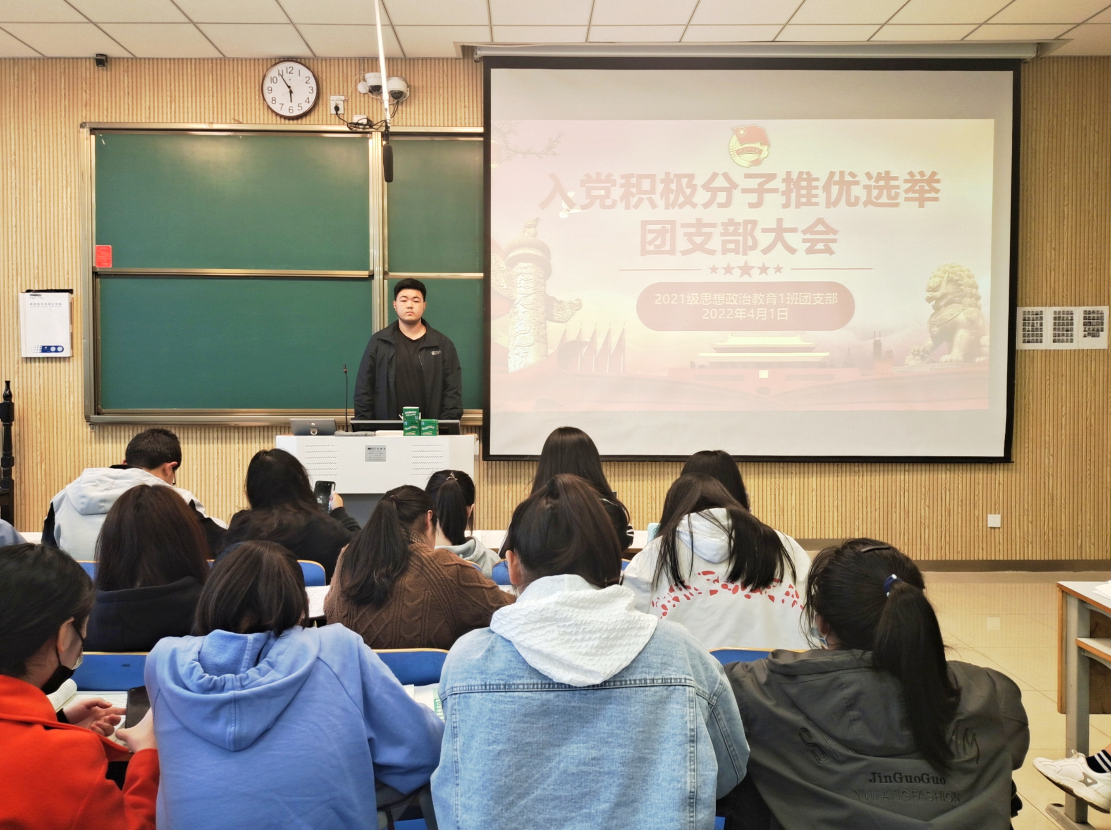 4月1日下午,德赢AC米兰官网2021级思想政治教育一班在社科楼515召开入党积极分子推优选举团支部大会。2021级思想政治教育一班全体团员共同参加了本次团支部大会。团支部大会由团支书戴翰林主持。