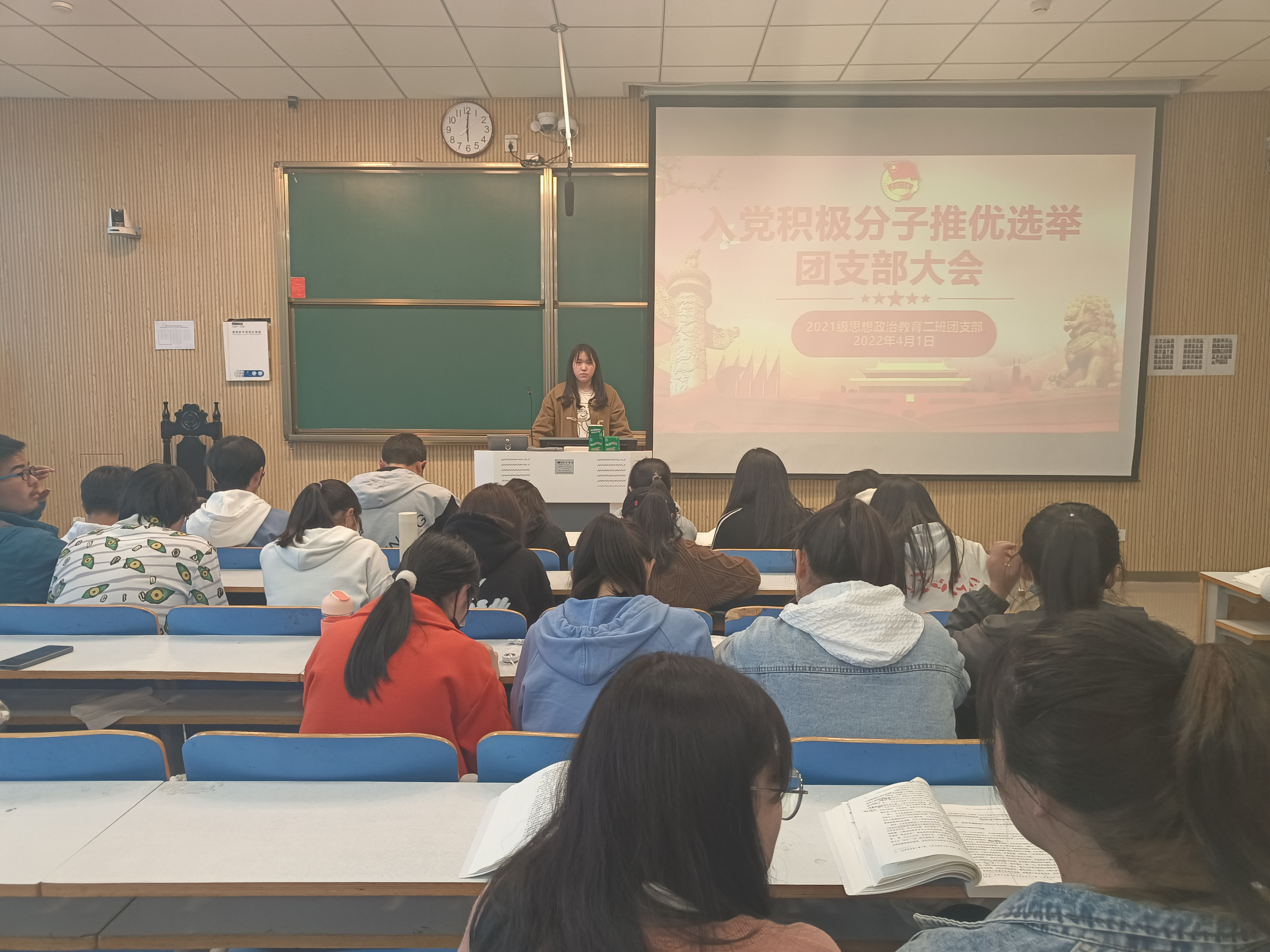 4月1日下午,德赢AC米兰官网2021级思想政治教育二班在社科楼515教室召开入党积极分子推优选举团支部大会。2021级思想政治教育二班全体团员参与此次团支部大会,团支部大会由团支书王婧欣主持。