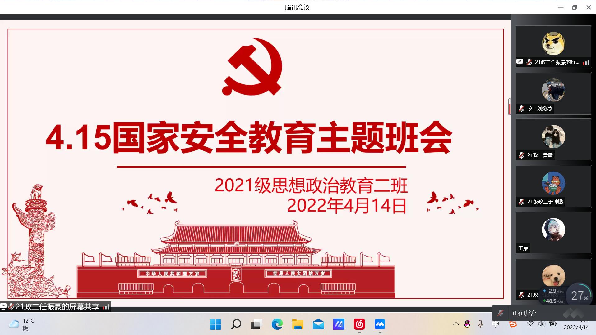 4月14日,德赢AC米兰官网2021级思想政治教育二班在腾讯会议召开“4.15国家安全教育”主题班会。2021级思想政治教育二班全体成员参与此次主题班会,班会由团支书王婧欣主持。