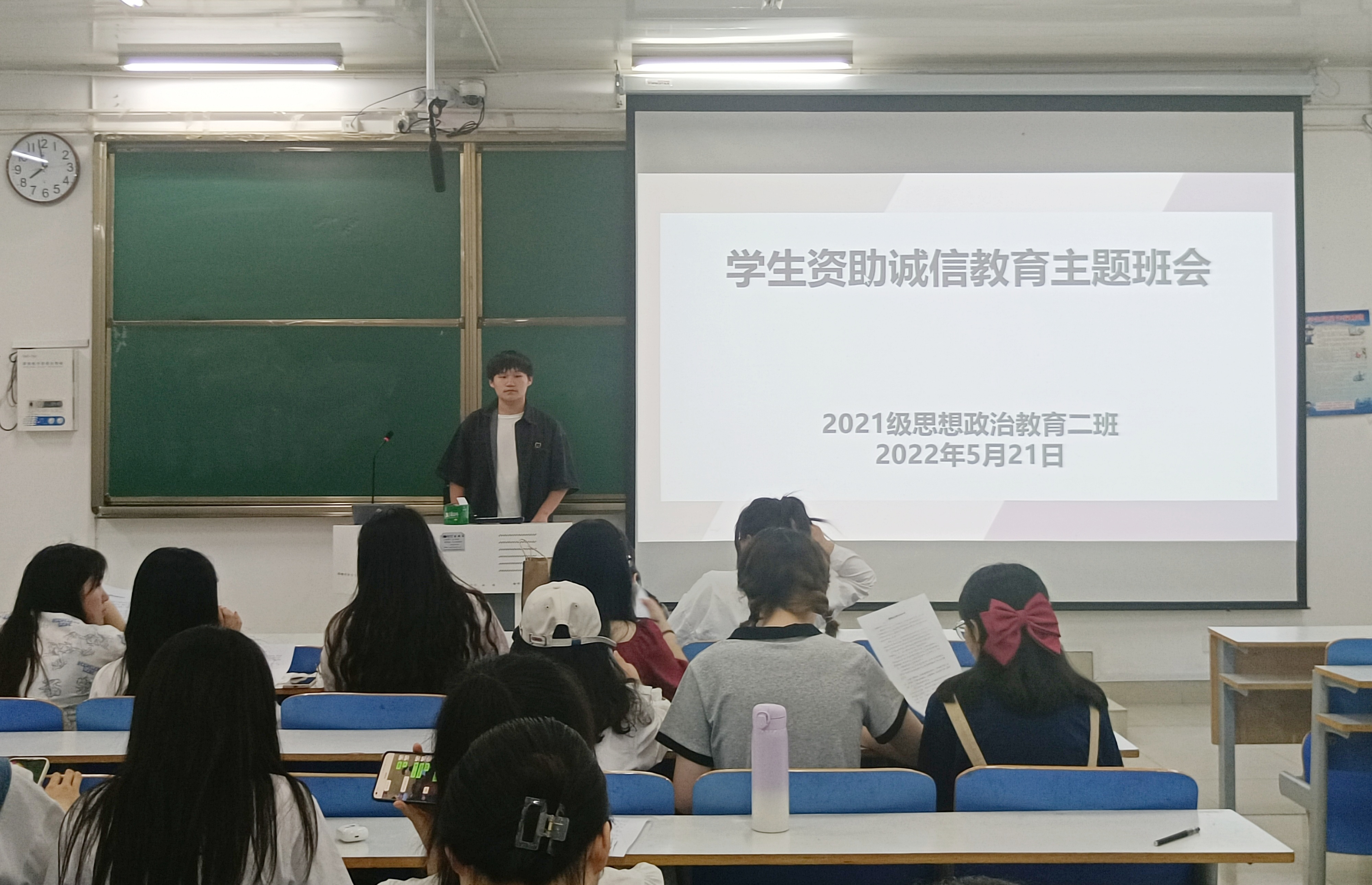 5月21日下午,德赢AC米兰官网2021级思想政治教育二班在社科楼514教室召开“学生资助诚信教育”主题班会。2021级思想政治教育二班全体同学参加此次班会。班会由副班长任振豪主持。
