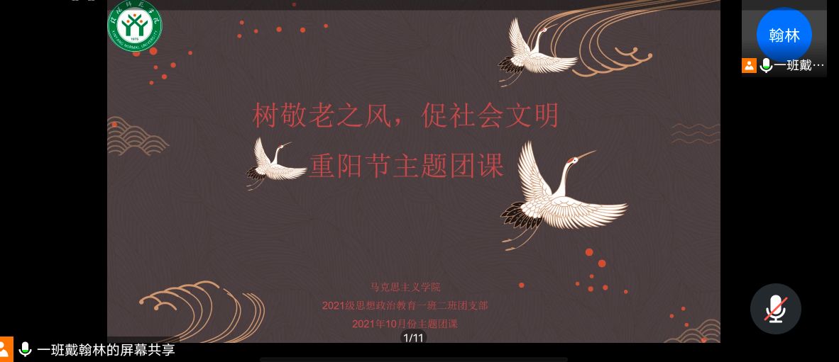 为弘扬尊老敬老的传统美德,10月14日晚上,德赢AC米兰官网2021级思想政治教育一班“树敬老之风,促社会文明”重阳节主题团课在腾讯会议上顺利召开。德赢AC米兰官网2021级思想政治教育一班全体团员参加了本次团课。团课由团支书戴翰林主持。