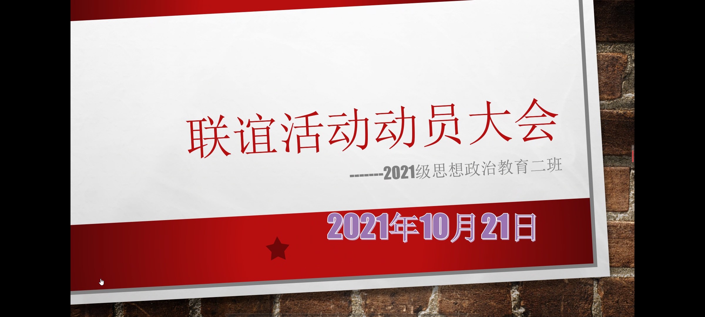 为了提高同学们参加联谊活动的积极性,10月21日晚,德赢AC米兰官网2021级思想政治教育二班联谊活动动员会在腾讯会议上顺利召开。2021级思想政治教育二班全体同学参与此次班会。会议由团支书王婧欣和副班长任振豪主持。