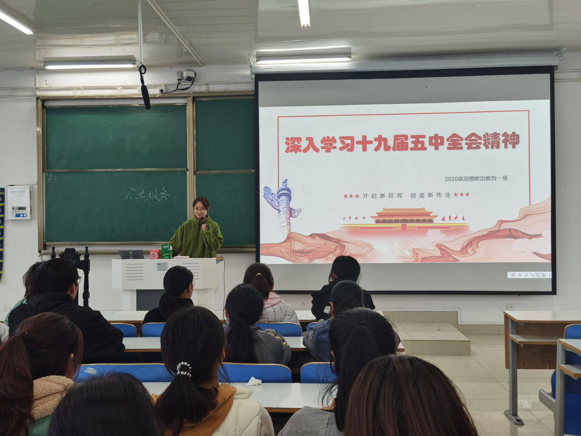 为了更进一步了解党的相关知识,学习党的相关理论,11月17日,2020级思想政治教育一班在社科楼514教室顺利召开“深入学习十九届五中全会精神”主题班会。辅导员曹栋以及2020级思想政治教育一班全体同学参加了本次班会。班会由团支书卢茜雨主持。