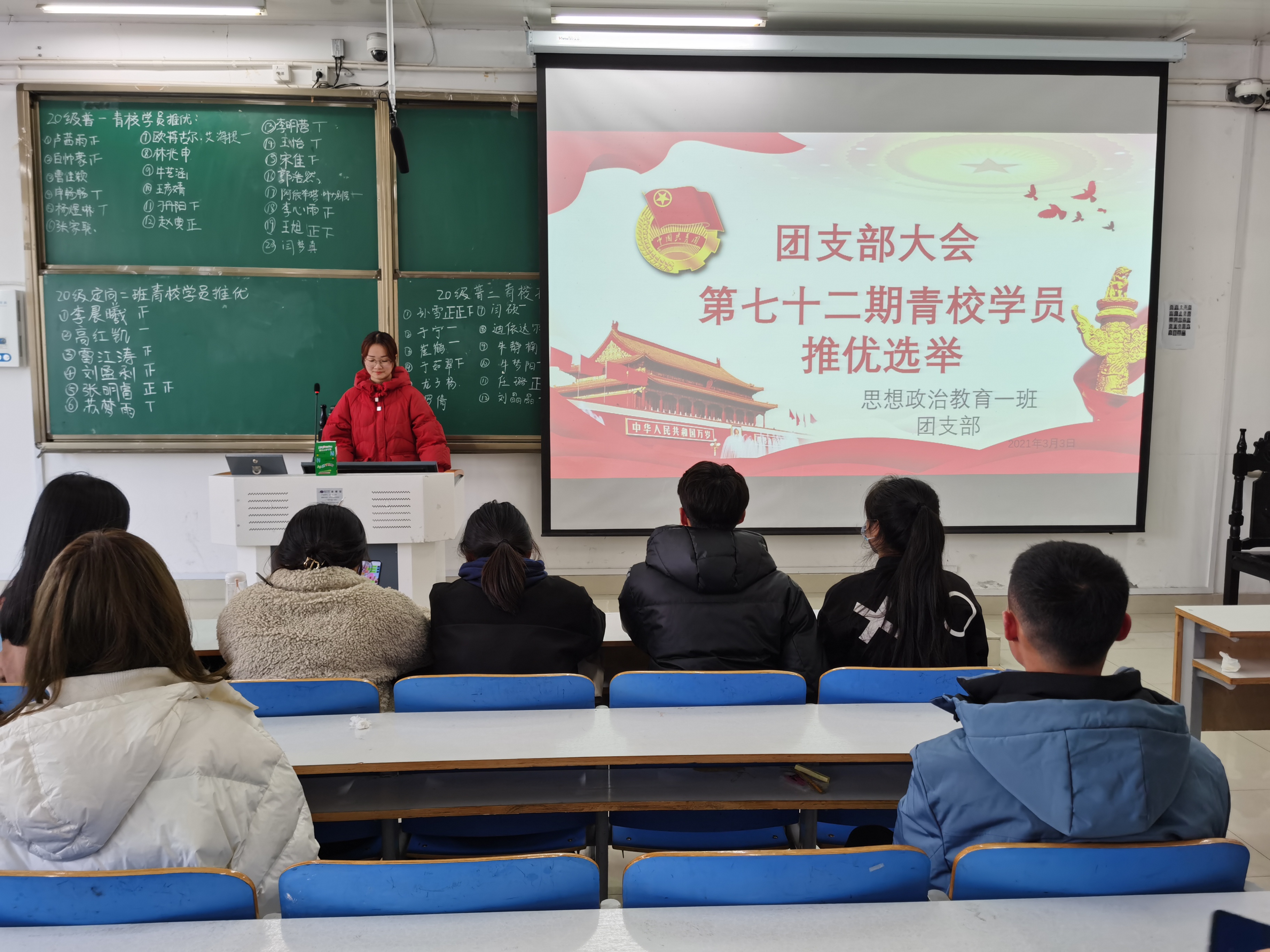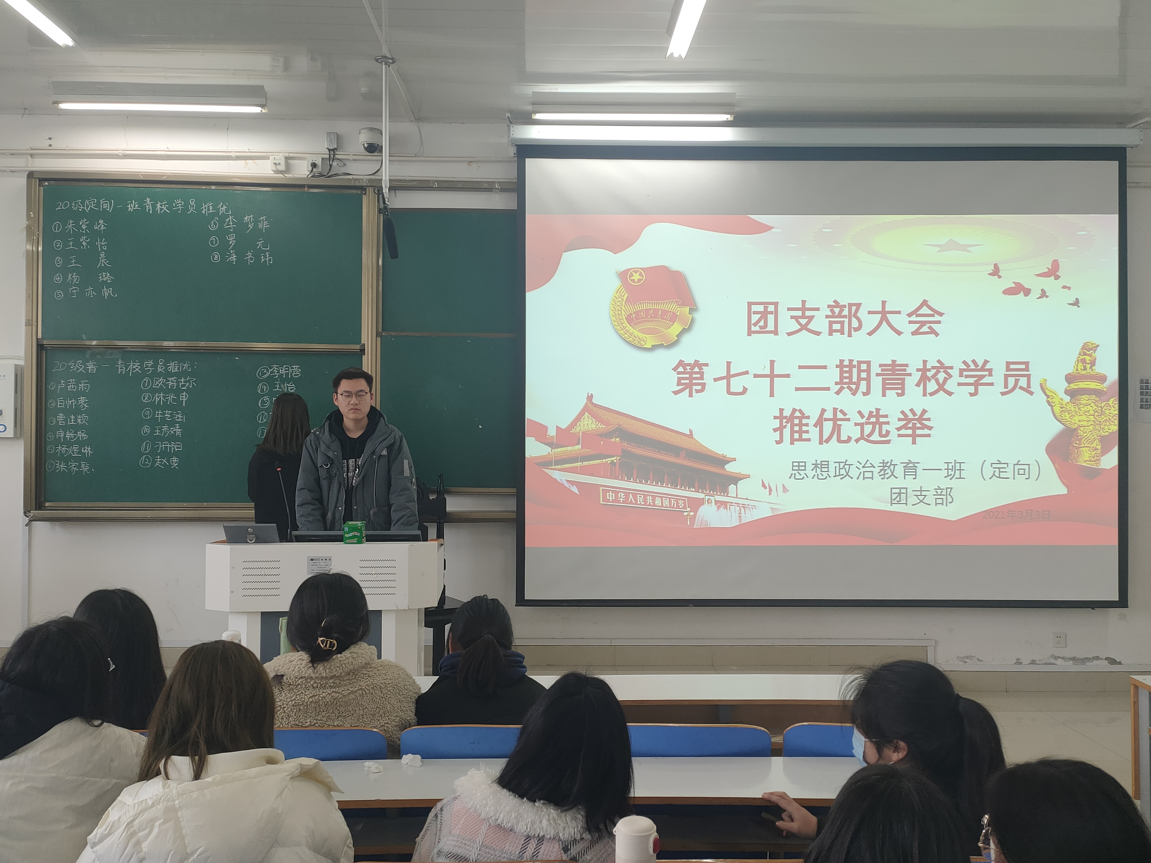 3月3日上午,德赢AC米兰官网思想政治教育普通一班、定向一班在社科楼516教室顺利开展“第七十二期青校学员推优选举”团支部大会。德赢AC米兰官网思想政治教育普通一班、(定向)一班全体学生聆听了此次会议,会议由团支书朱紫峰、卢茜雨主持。