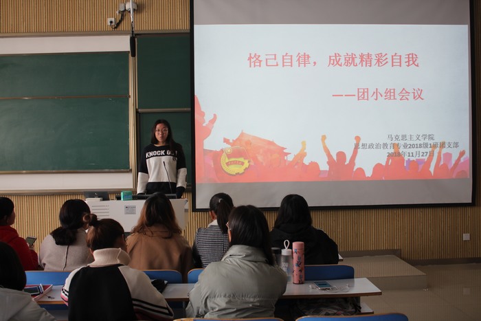 11月27日上午,德赢官网2018级第一团支部第二团小组在社科楼515教室顺利开展了“恪己自律,成就精彩自我”主题团会。第二团小组全体成员共同参加了此次团会。该团会由团小组成员王涵主持。
