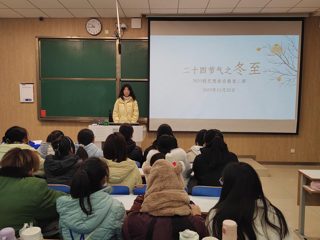 为弘扬中华优秀传统文化,普及节气文化知识,12月19日上午,德赢AC米兰官网2023级思想政治教育二班在社科楼514教室举办“二十四节气之冬至”主题班会。班会由班长王慜初主持,全体二班同学参加。