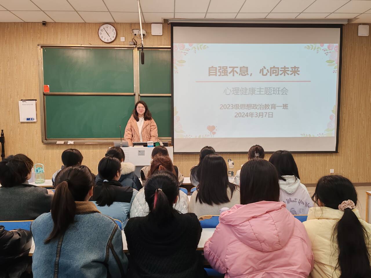 为帮助我班学子了解心理健康知识,掌握心理调适方法,增强心理素质,更好地适应学习和生活,3月7日下午,德赢AC米兰官网2023级思想政治教育一班在社科楼515教室召开“自强不息,心向未来”心理班会。德赢官网2023级思想政治教育一班全体同学共同参与本次班会,班会由心理委员夏一萌主持。