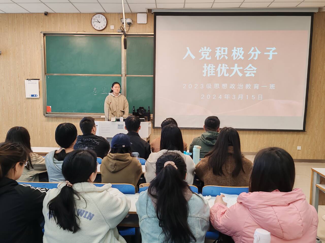 为使支部团员积极向党组织靠拢,深刻学习党的思想,加强支部团员的积极性,向党组织输送新鲜血液,3月15日上午,德赢AC米兰官网2023级思想政治教育一班团支部在社科楼515教室召开入党积极分子推优大会。德赢官网专职辅导员沈海蓄和2023级思想政治教育一班全体团员出席本次大会,大会由团支书张卓主持。