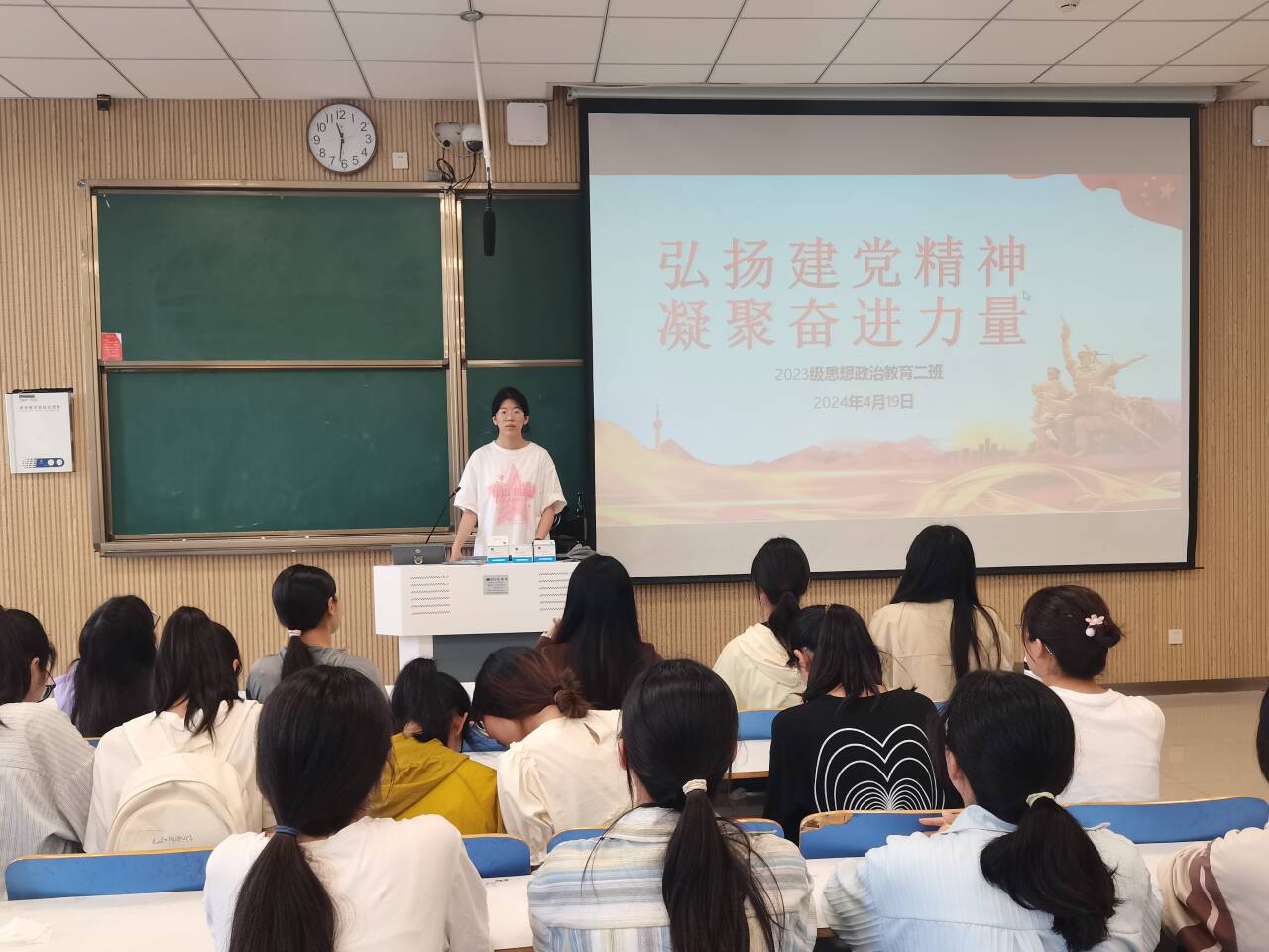为弘扬伟大建党精神,确保广大青年大学生始终坚持听党话、跟党走,4月16日下午,德赢AC米兰官网2023级思想政治教育二班在社科楼515教室召开“弘扬建党精神,凝聚奋进力量”主题团课。本次主题团课由团支书王慜初主持,全体二班同学参加。