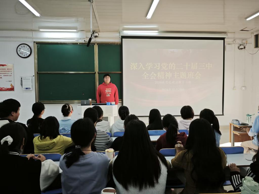 为深入学习党的二十届三中全会精神,深刻领会全面深化改革、推进中国式现代化的重大意义和战略部署,10月23日,德赢AC米兰官网 2024 级思想政治教育二班于社科楼514教室开展了 “深入学习党的二十届三中全会精神” 主题班会。本次班会由班长王志颖主持,二班全体同学共同参与。