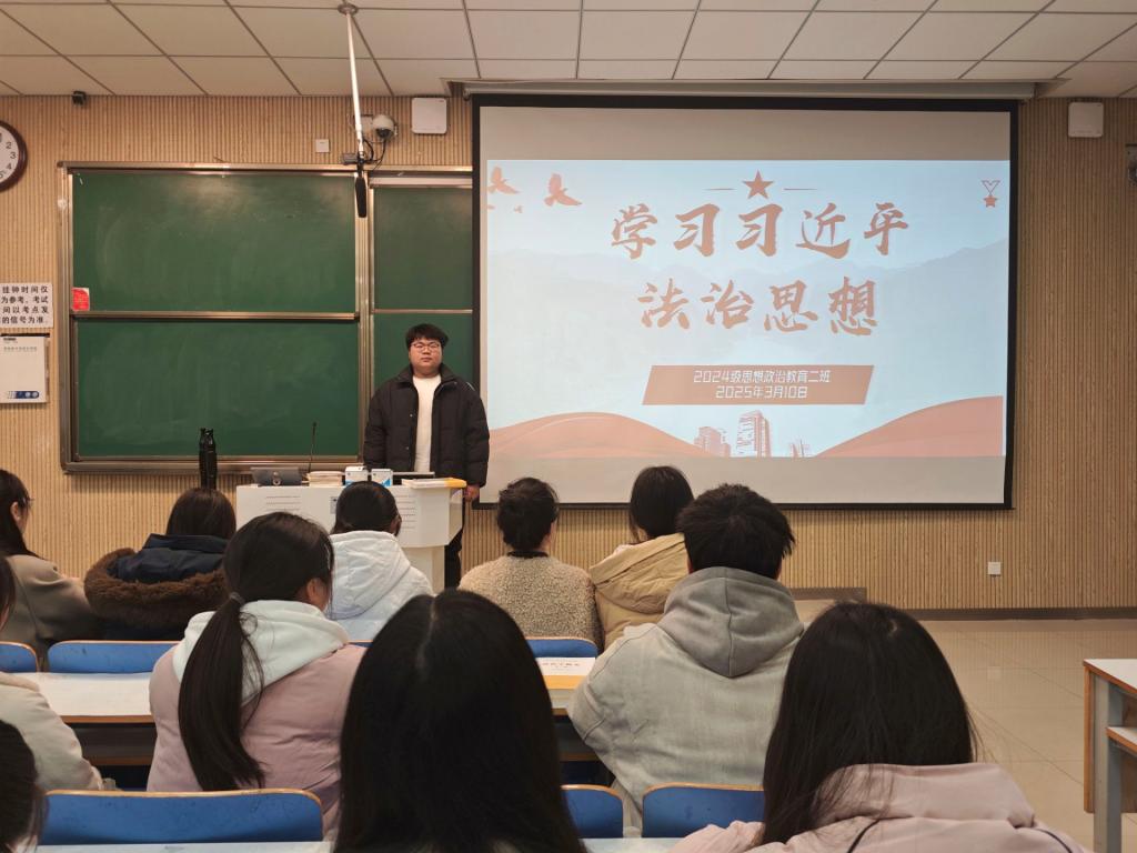 为深入学习习近平法治思想,引导学生增强法治意识,树立法治信仰,3月10日下午,德赢AC米兰官网2024级思想政治教育二班在社科楼515教室举办了“学习习近平法治思想”主题班会。本次班会由团支书王志颖主持,二班全体同学积极参与。