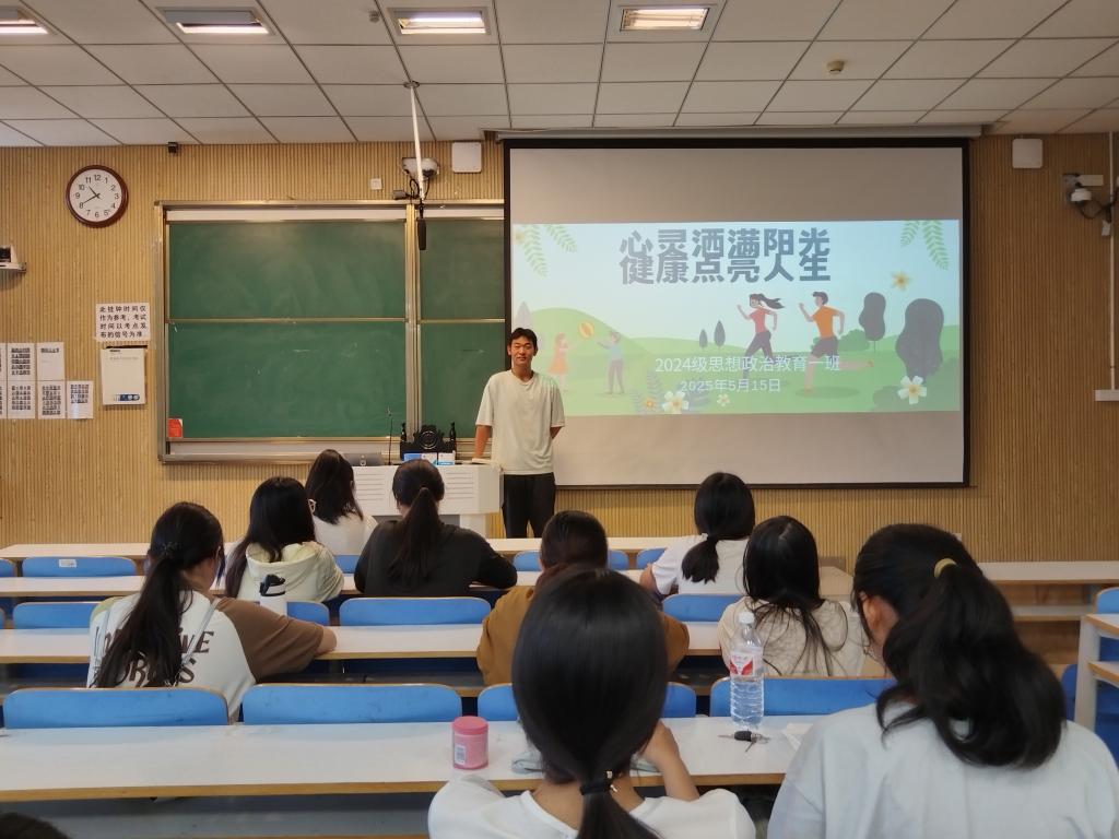 为提升我班学生心理健康意识,促进其身心健康全面发展,5月15日下午,2024级德赢AC米兰官网思想政治教育一班于社科楼515教室开展“心灵洒满阳光,健康点亮人生”主题班会。本次班会由副班长马奔主持,一班全体同学参加。