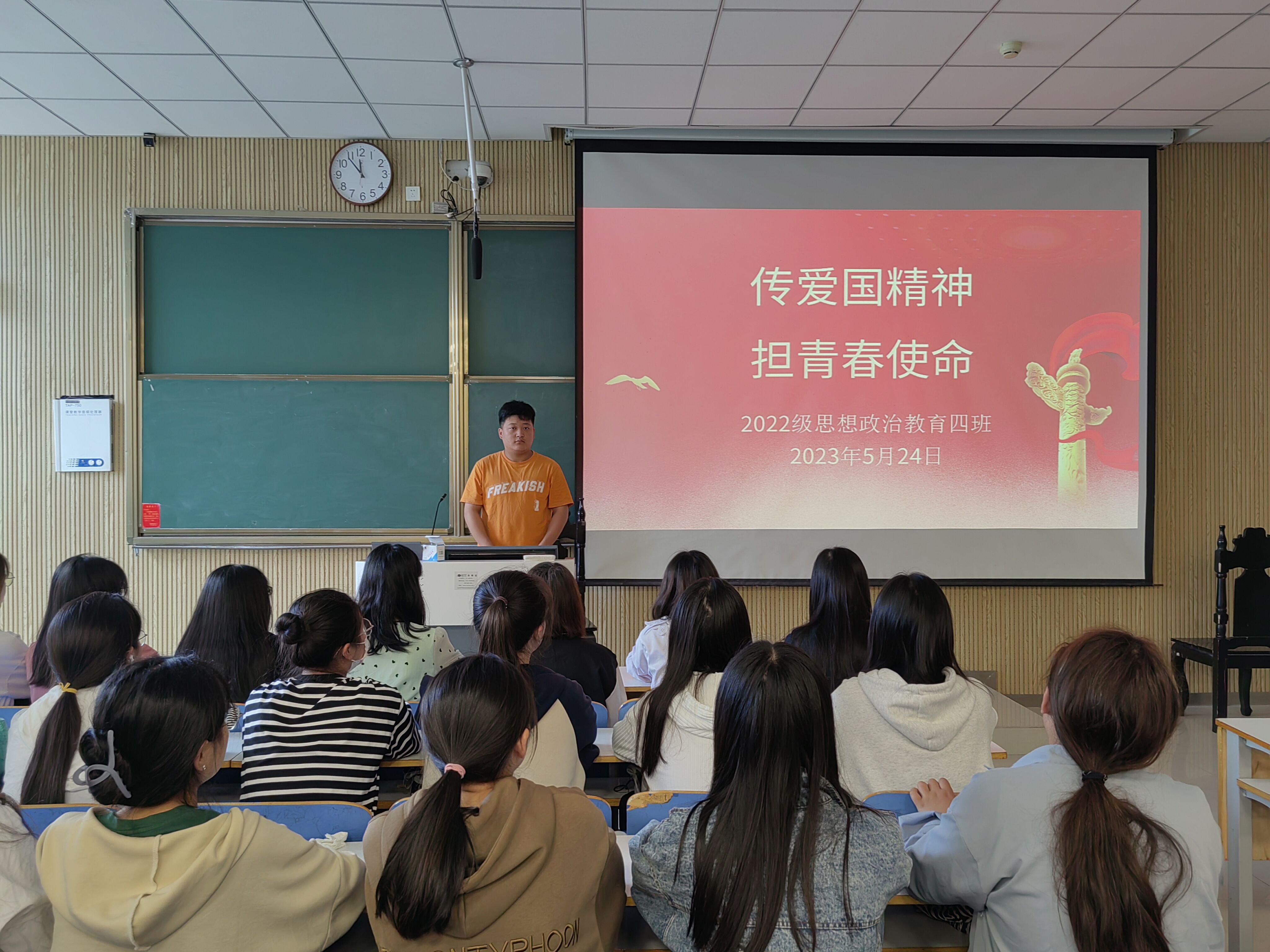 为加强爱国主义教育,培养同学们的爱国主义情怀, 5月24日上午,德赢AC米兰官网2022级思想政治教育四班在社科楼515教室召开“传爱国精神,担青春使命”主题班会,德赢官网2022级思想政治教育四班全体同学参加本次班会。会议由副班长宋奕铭主持。