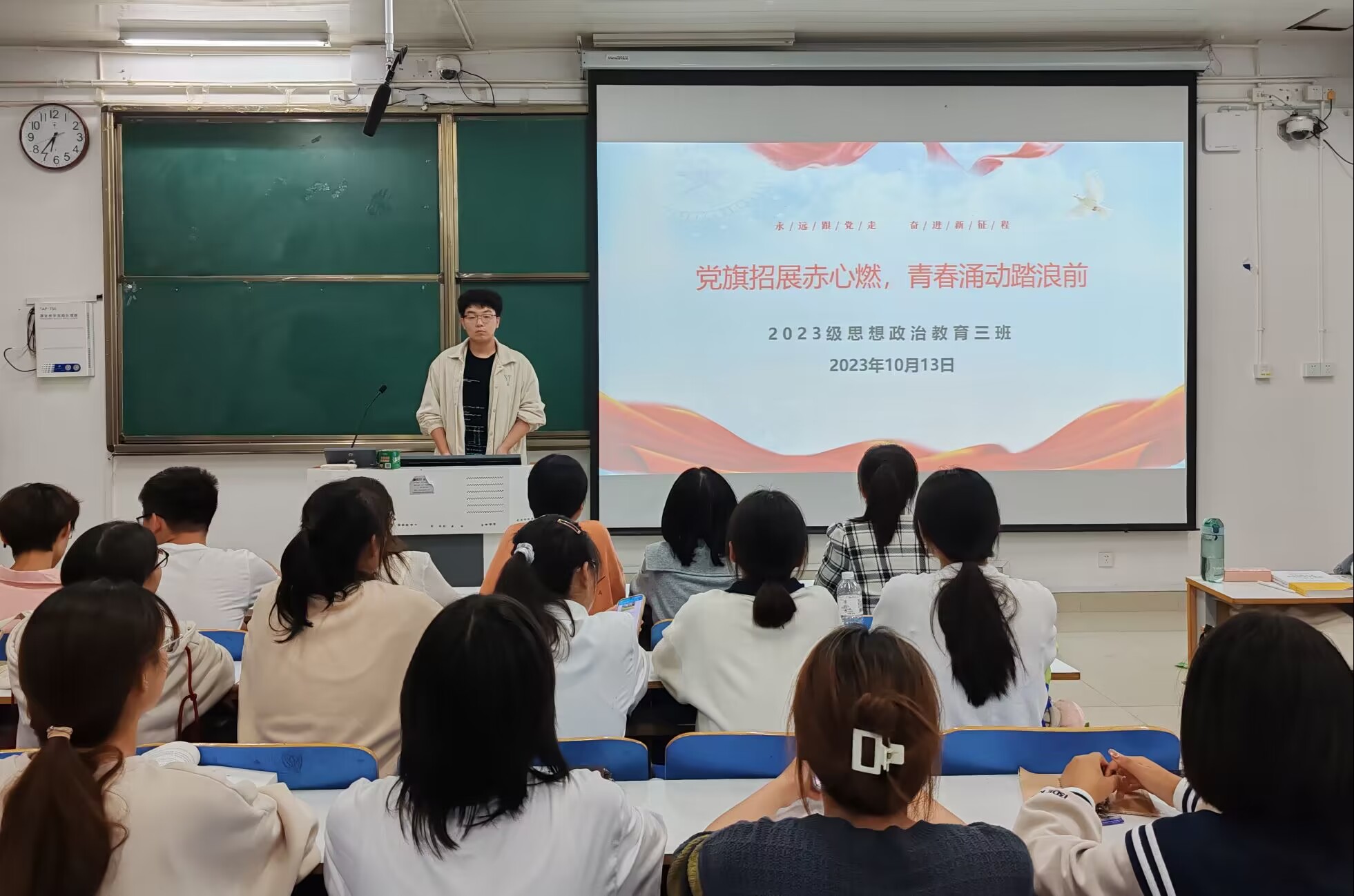 10月13日上午,德赢AC米兰官网2023级思想政治教育三班在社科楼515教室召开“党旗招展赤心燃,青春涌动踏浪前”主题团课。德赢官网2023级思想政治教育三班全体成员共同参加此次团课,团课由团支书郝瀚主持。