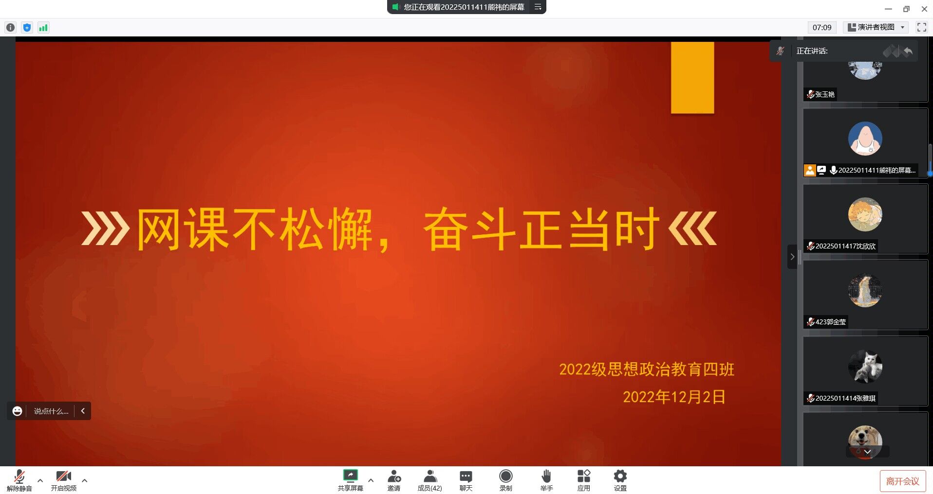 12月2日下午,德赢AC米兰官网2022级思想政治教育四班召开“网课不停歇,奋斗正当时”主题班会,班会以线上召开腾讯会议的方式进行,2022级思想政治教育四班全体同学参加会议。班会由学习委员熊祎主持。