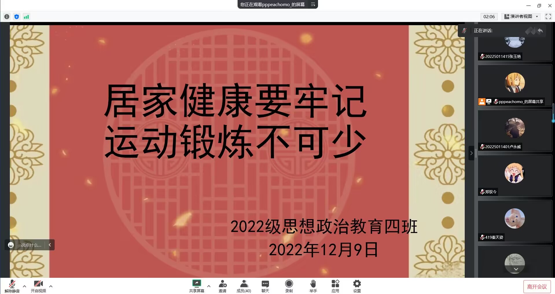 12月9日下午,德赢AC米兰官网2022级思想政治教育四班线上召开“居家健康要牢记,运动锻炼不可少”主题班会,2022级思想政治教育四班全体同学参与本次班会。会议由文体委员周可盈主持。