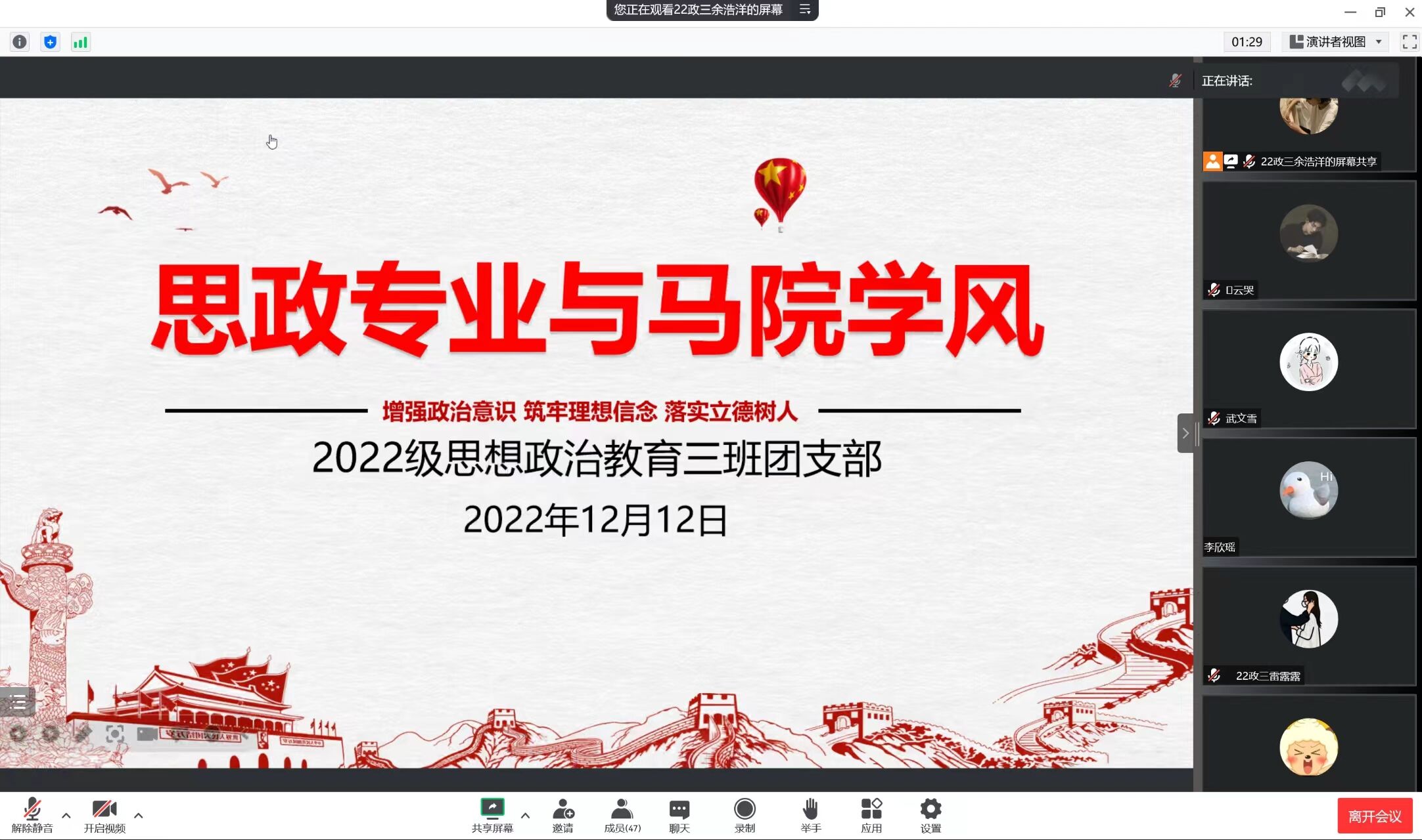筑牢理想信念,落实立德树人。为建设创新型思政专业,打造优良的马院学风,12月12日上午,德赢AC米兰官网2022级思想政治教育三班在线上召开“思政专业与马院学风”主题团课。2022级思想政治教育三班全体成员共同参与团课,团课由团支书余浩洋主持。