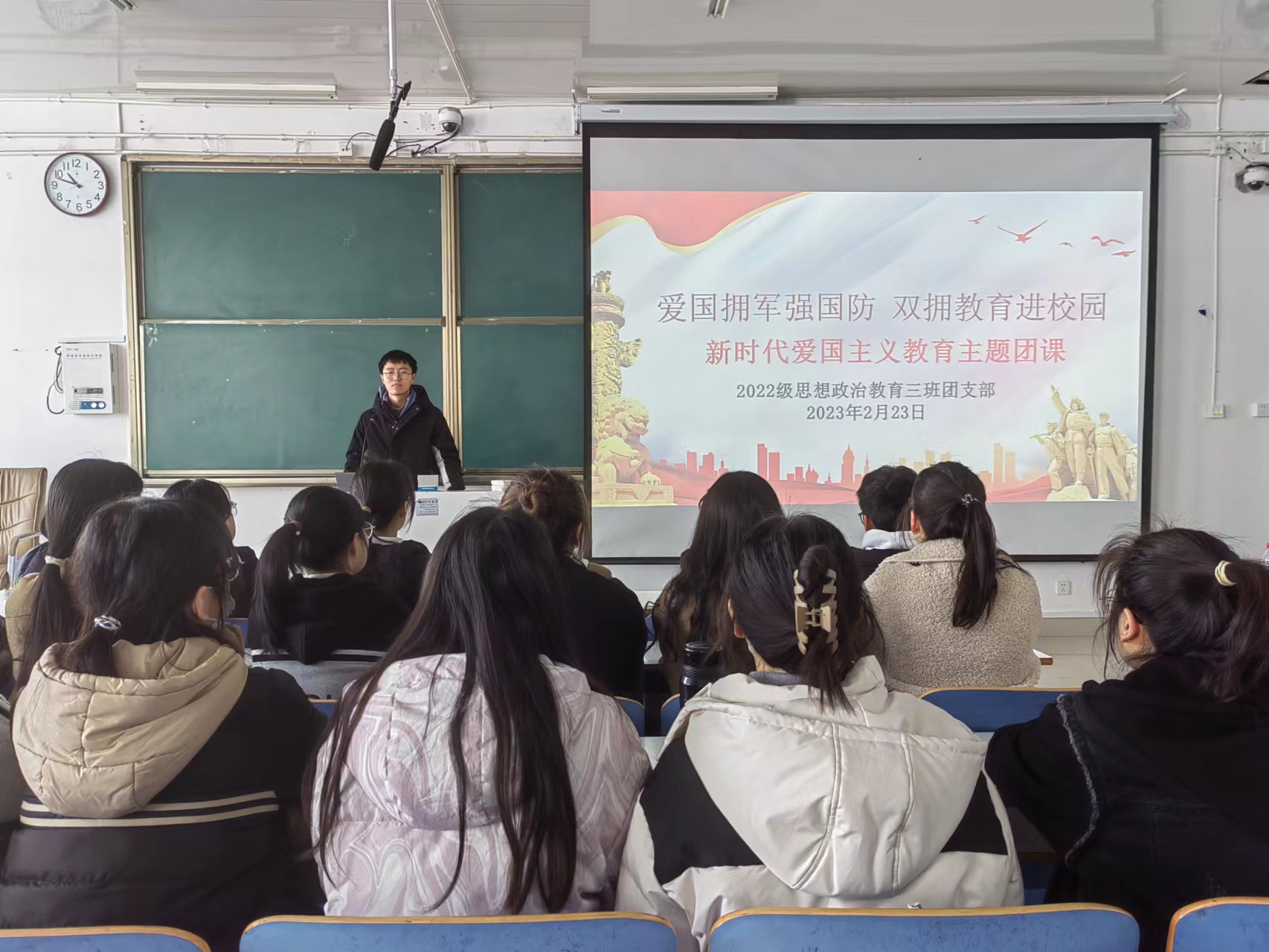 为强化大学生爱国意识,发扬新时代爱国精神,2月19日上午,德赢AC米兰官网2022级思想政治教育三班在社科楼514教室召开新时代爱国主义教育主题团课。德赢官网2022级思想政治教育三班全体成员共同参加此次团课,团课由团支书余浩洋主持。