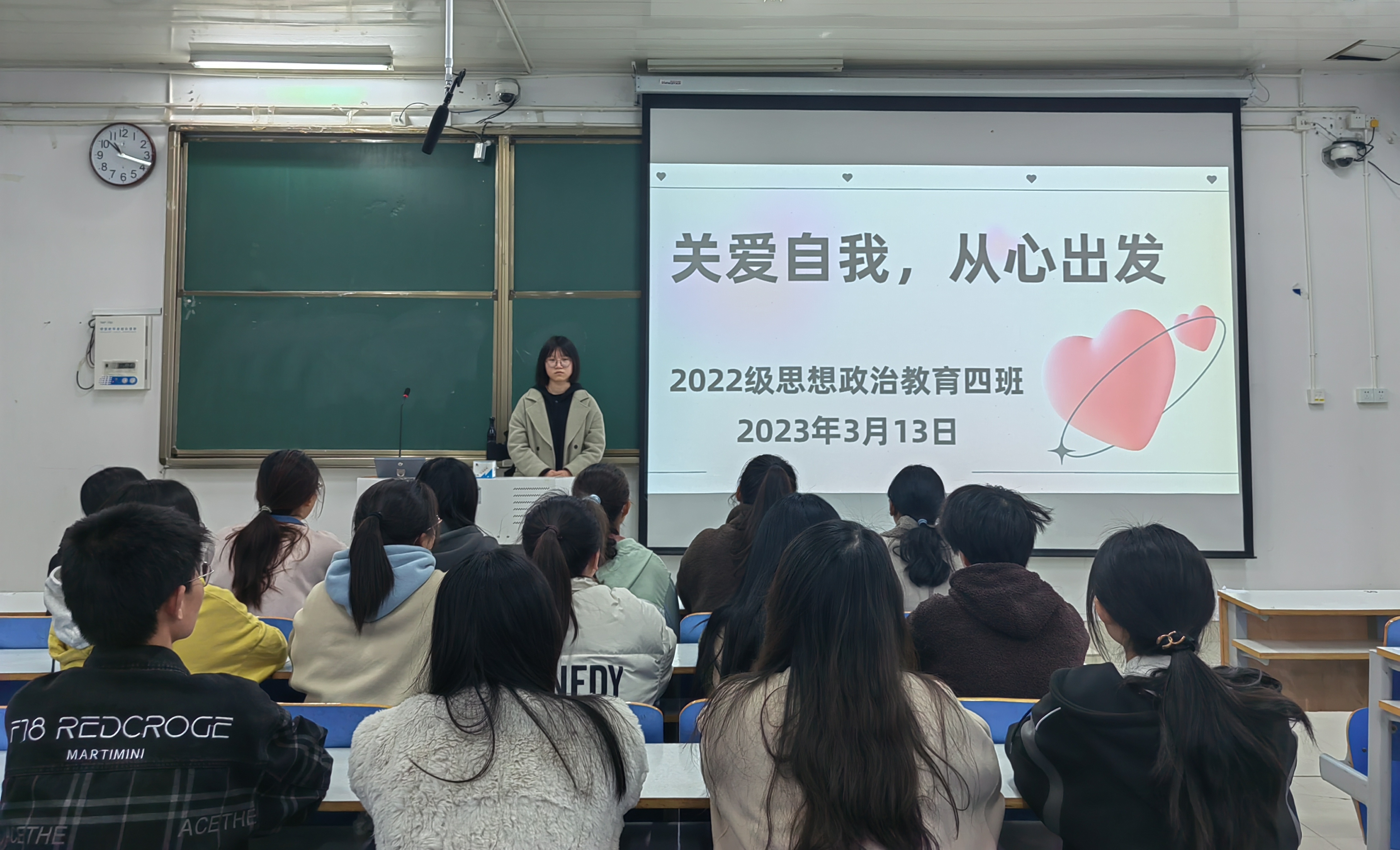 为加强学生心理健康教育,促进其身心和谐发展,3月13日下午,德赢AC米兰官网2022级思想政治教育四班在社科楼514教室召开“关爱自我,从心出发”主题班会,2022级思想政治教育四班全体同学参加本次班会。班会由心理委员徐成若主持。