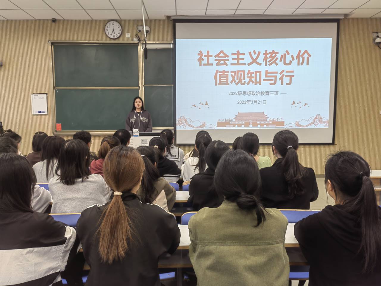 3月21日下午,德赢AC米兰官网2022级思想政治教育三班在社科楼515教室召开“社会主义核心价值观知与行”主题班会。德赢官网2022级思想政治教育三班全体成员共同参加此次班会。班会由副班长雷露露主持。
