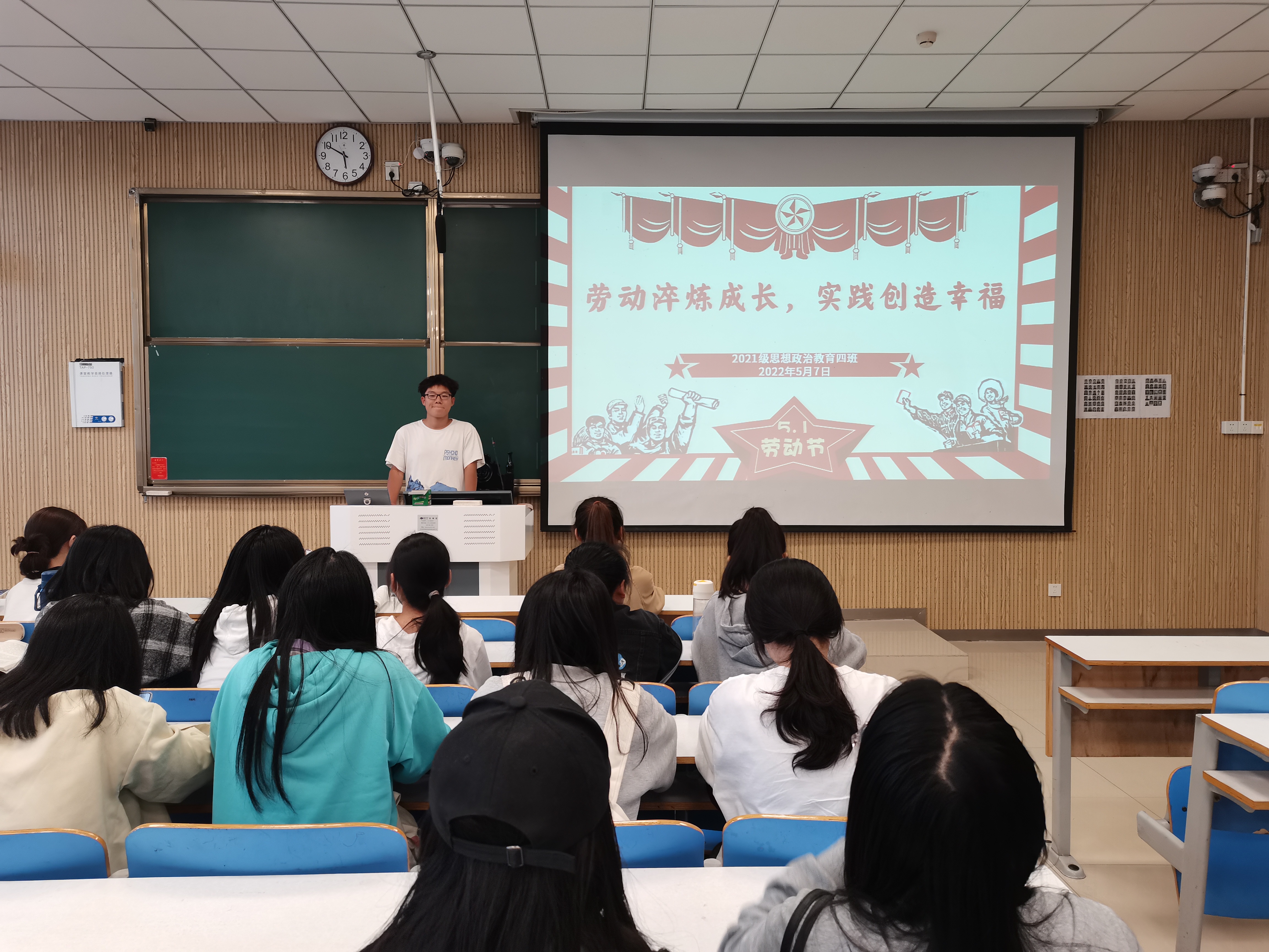 班会伊始,常康哲对五一劳动节进行简要介绍,并通过播放觉醒年代中的视频片段介绍五一劳动节的由来。随后,他指出,劳动是一种责任与担当,每一个辛勤劳动的人都值得尊重。紧接着,他为大家讲述习总书记在全国劳动模范和先进工作者表彰大会的重要讲话。最后,常康哲联系生活和实践,讲述弘扬劳动精神的重要性,希望大家能在实践活动中培养劳动能力,发扬优良传统,承担历史使命。