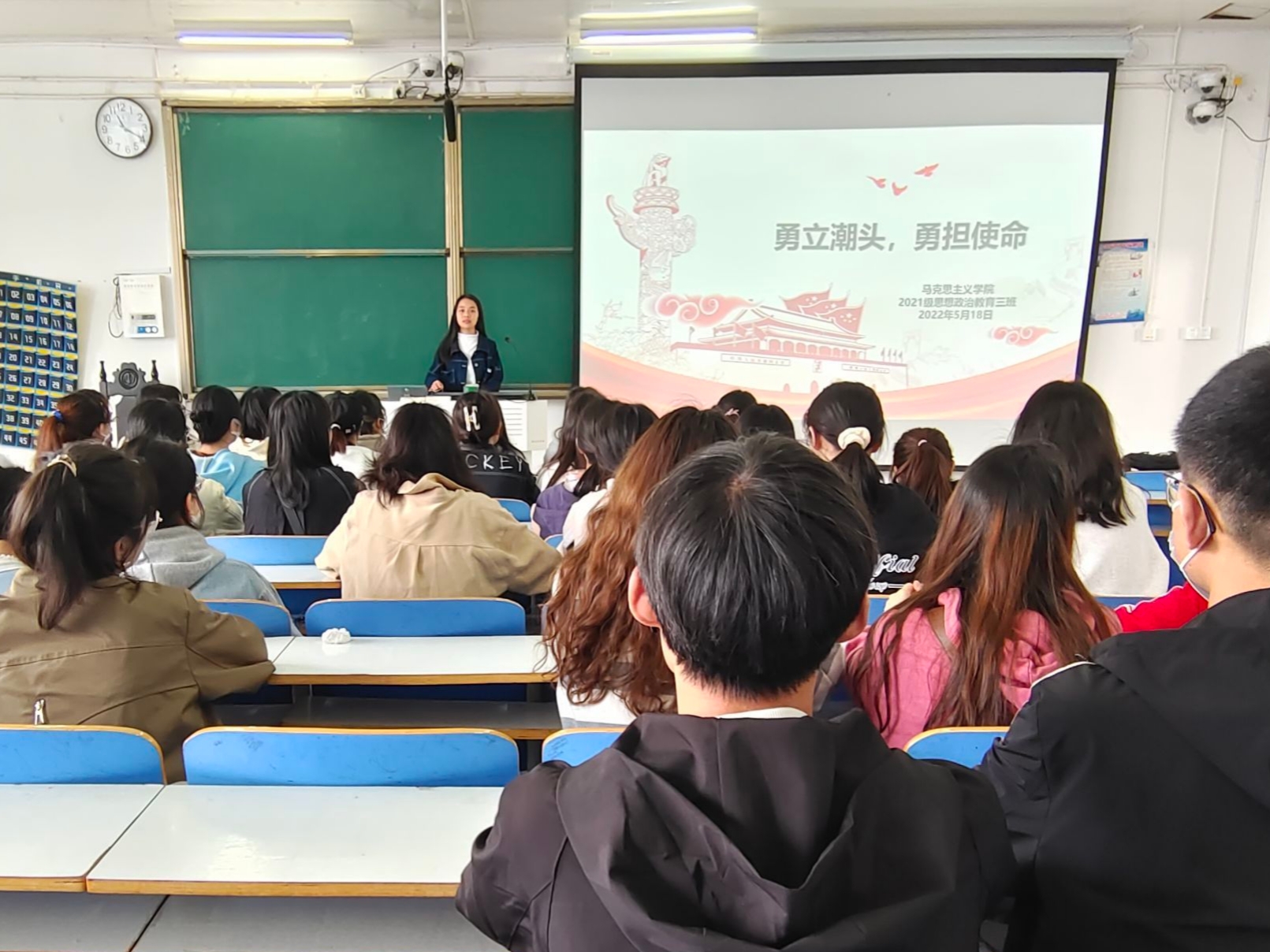 5月18日上午,德赢AC米兰官网2021级思想政治教育三班在社科楼514教室召开“勇立潮头,勇担使命”主题团课。2021级思想政治教育三班全体成员参与此次团课。团课由团支书王岚霄主持。