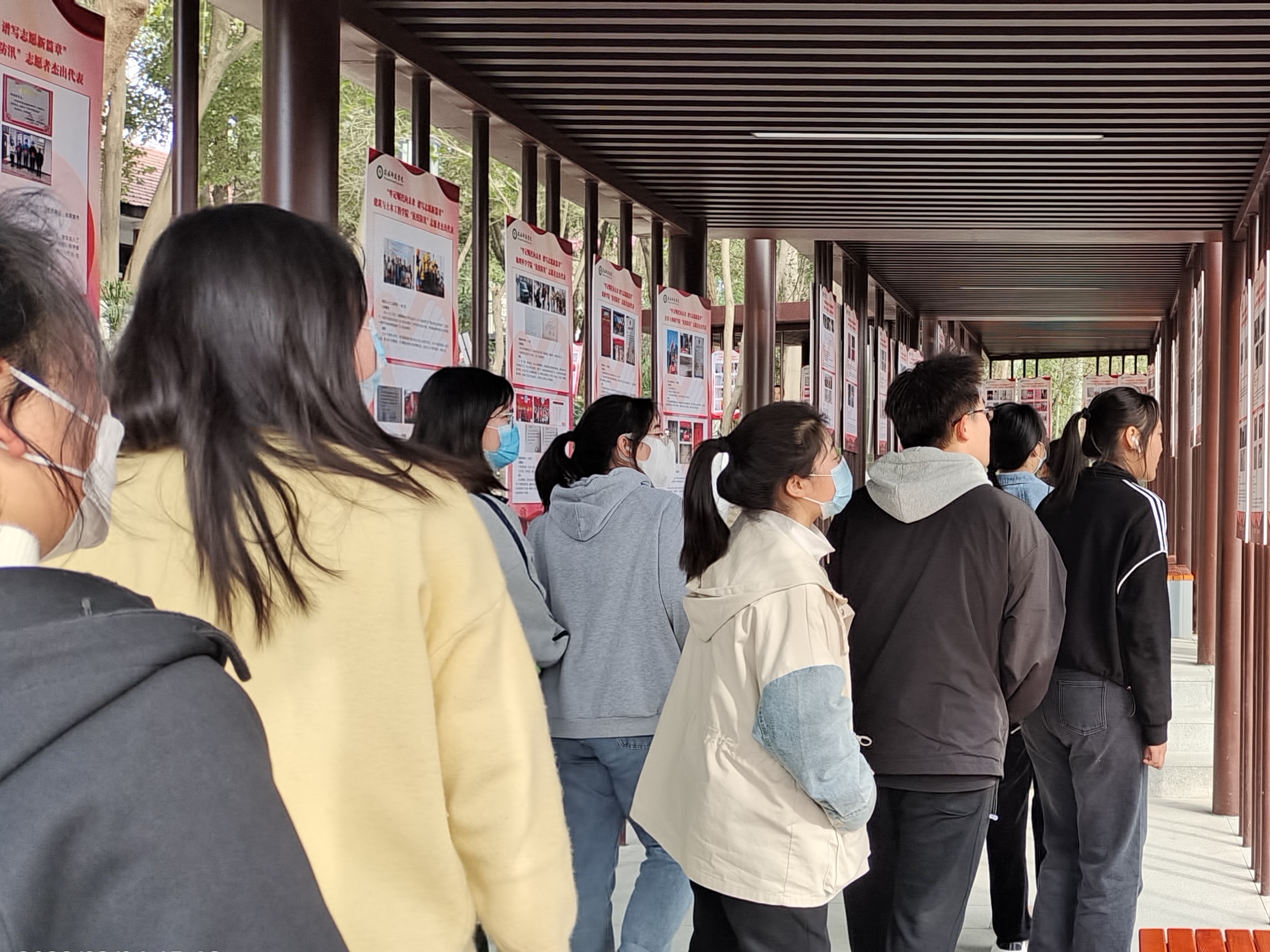 活动伊始,刘珂含组织同学们在二舍楼下有序排队,并清点人数。接着,她向同学们简要介绍本次参观活动的目的是激发同学们的爱国情感,激励同学们积极参与抗击疫情志愿活动。随后,她带领同学们参观谭山书院文化长廊。同学们久久驻足,细细观看。参观展览活动后,部分同学向大家分享参观后的自身感受和体会。同学们纷纷表示,疫情下的美好生活来之不易,大学生无私奉献的精神令人十分佩服。作为当代大学生,当坚定信念,努力读书,承担未来建设祖国的重任。最后,同学们在刘珂含和常康哲的带领下收获满满,满载而归,随后依次有序离开。