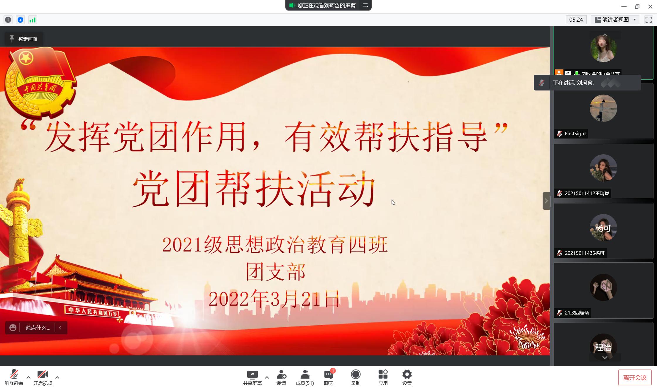 3月21日下午,德赢AC米兰官网2021级思想政治教育四班开展线上“发挥党团作用,有效帮扶指导”党团帮扶活动。辅导员高小佳、预备党员王晓鹭、姚勇毅及2021级思想政治教育四班全体团员共同参加此次活动。活动由团支书刘珂含主持。