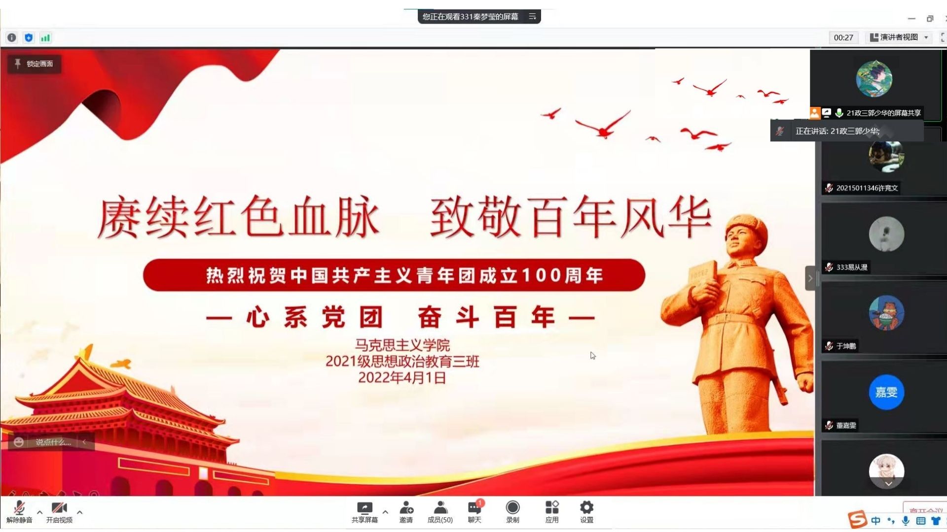 4月1日晚上,德赢AC米兰官网2021级思想政治教育三班召开线上“赓续红色血脉,致敬百年风华”主题团课。2021级思想政治教育三班全体团员参与了此次团课,团课由团支书郭少华主持。