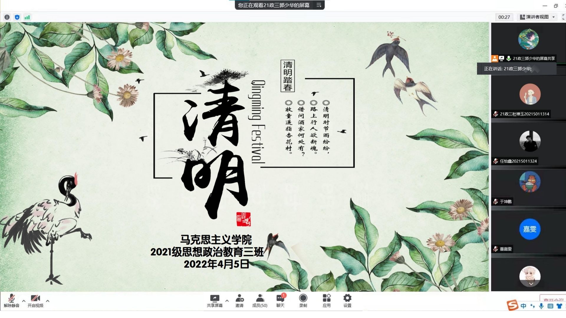 4月5日晚上,德赢AC米兰官网2021级思想政治教育三班召开线上“清明踏春,缅怀先烈”主题团课。2021级思想政治教育三班全体团员参加此次团课。团课由团支书郭少华主持。