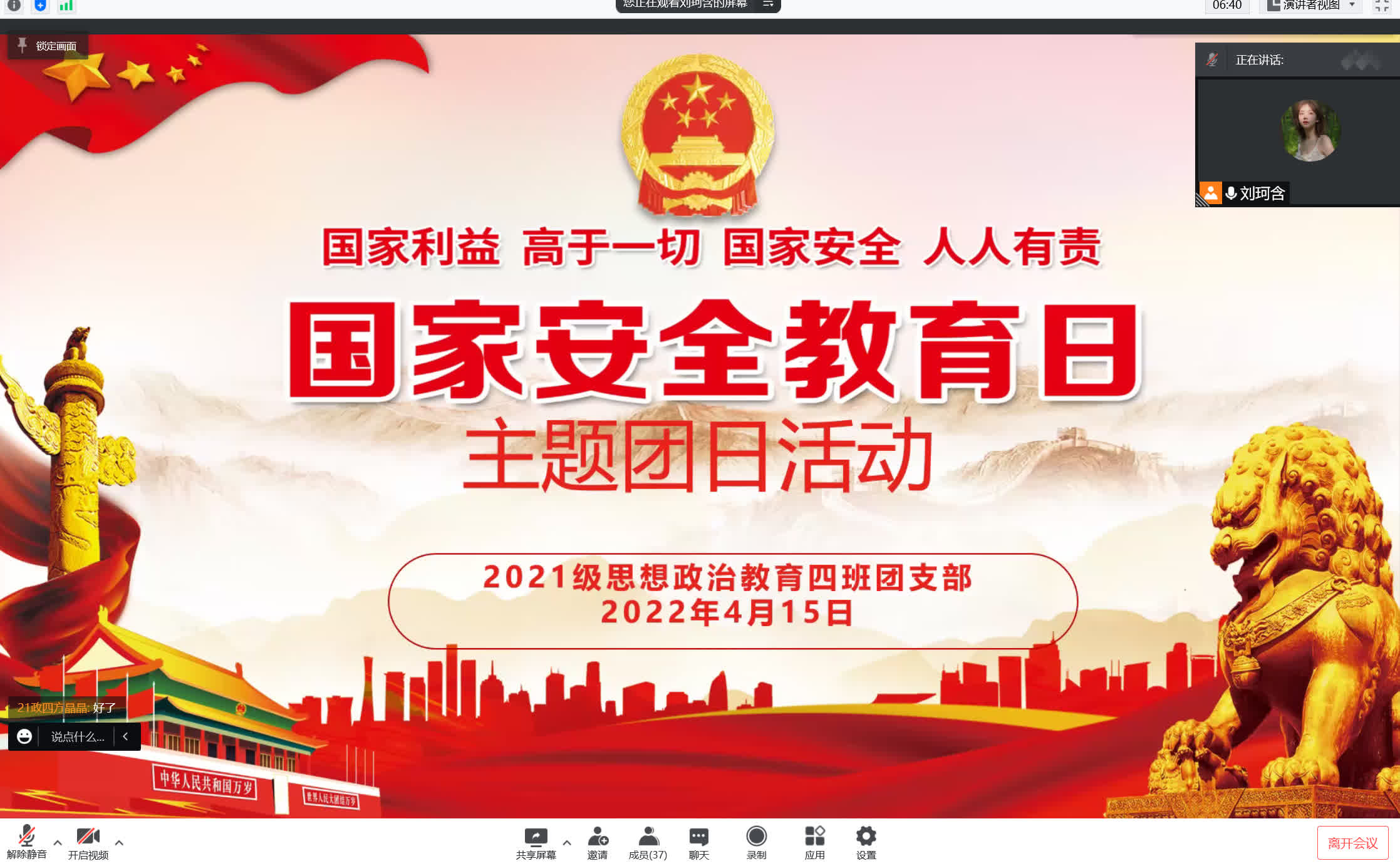 刘珂含依次从“何为国家安全”、“当前国际国内形势”、“危害国家安全的行为及相关罪名”、“如何维护国家安全”和“谁来保卫国家安全”五个方面对会议内容展开介绍。会议伊始,刘珂含带领我班团员观看不法分子危害国家安全的案例视频,指出国家安全与每个人的生活息息相关。她强调,国家利益高于一切,国家安全人人有责。随后,她为大家讲述危害国家安全行为的分类和相关法条内容,并详细介绍维护国家安全之可行方法和建议。最后,她重点强调,青年大学生要自觉维护祖国的安全和利益,积极向周围的人做好国家安全知识的宣传工作。