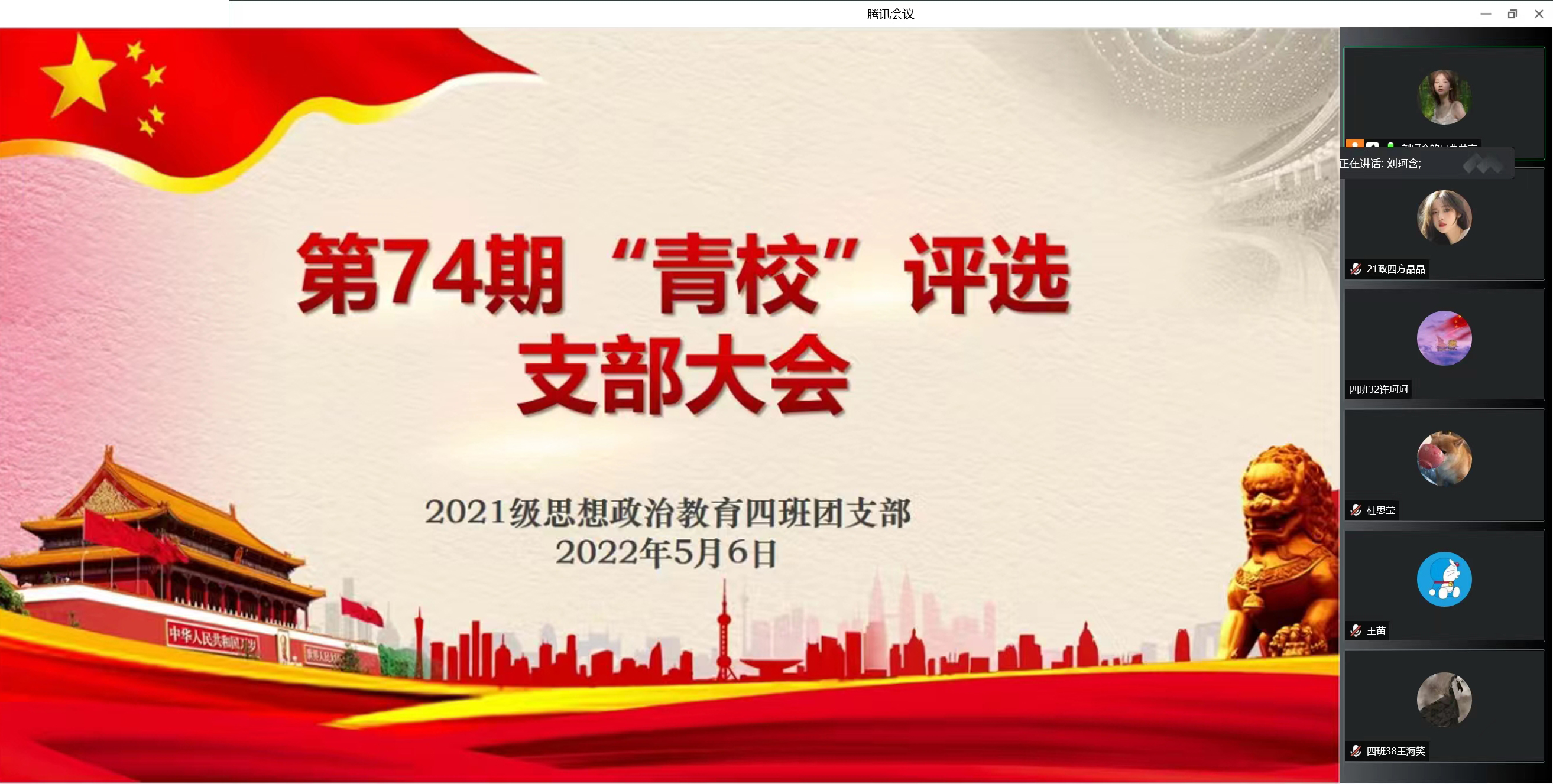 5月6日下午,德赢AC米兰官网2021级思想政治教育四班线上召开第74期青校评选支部大会。德赢AC米兰官网2021级思想政治教育四班全体成员共同参与本次会议。会议由团支书刘珂含主持。
