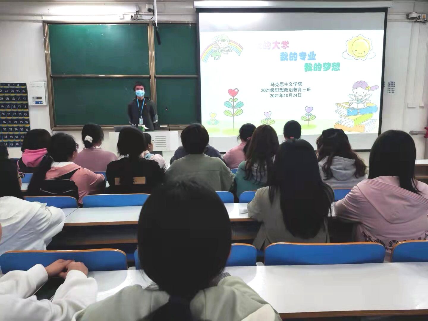 为了让同学们充分融入班集体,深入认识、了解大学生活,加深对所学专业的认识,从而尽快明确学习目标,树立职业理想,规划好大学四年的生活。10月24日下午,2021级思想政治教育三班在社科楼515组织开展“我的大学、我的专业、我的梦想”主题班会。2021级思想政治教育三班全体成员共同参加,会议由团支书郭少华和副班长王岚霄主持。