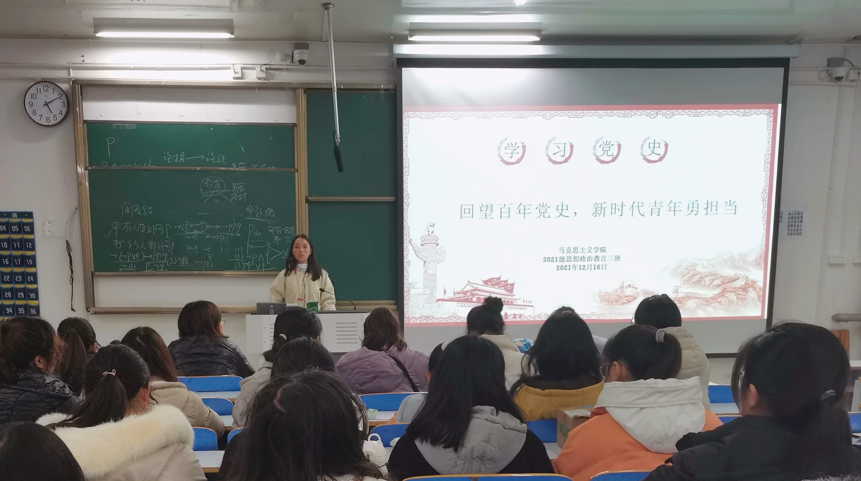 12月16日下午,德赢AC米兰官网2021级思想政治教育三班在社科楼514教室举办“回望百年党史,新时代青年勇担当”主题团课。2021级思想政治教育三班全体团员参加了此次团课。团课由团支部副书记王岚霄主持。
