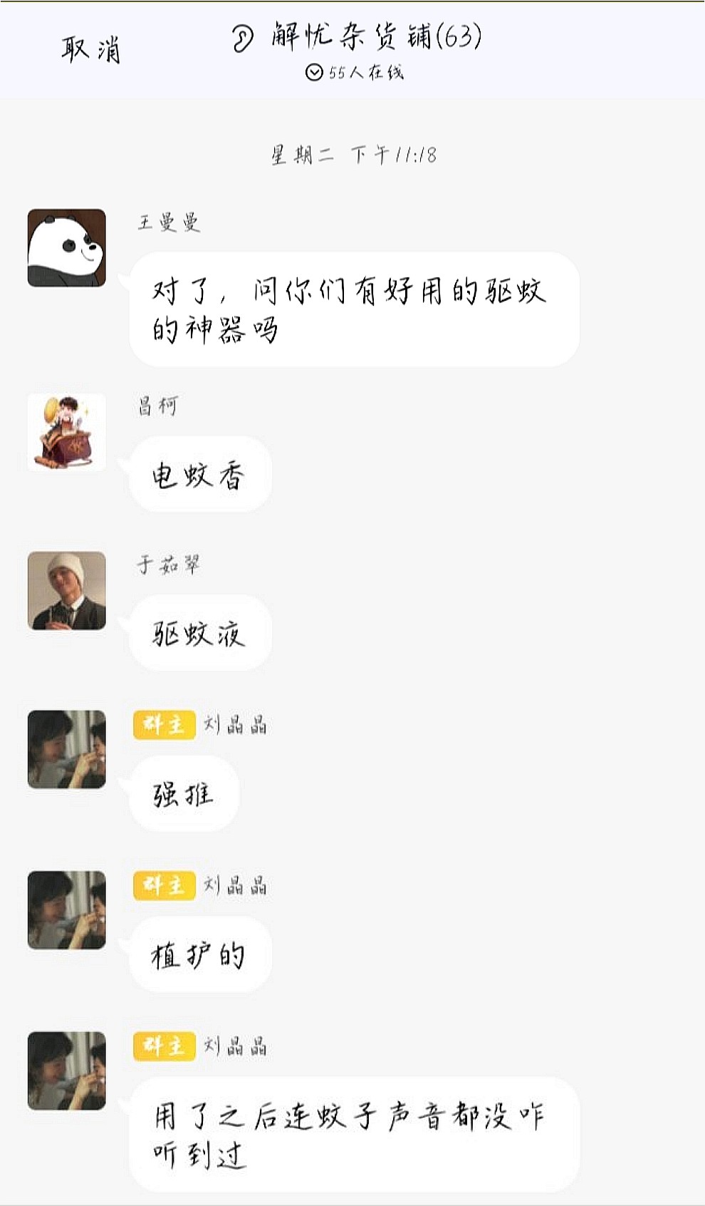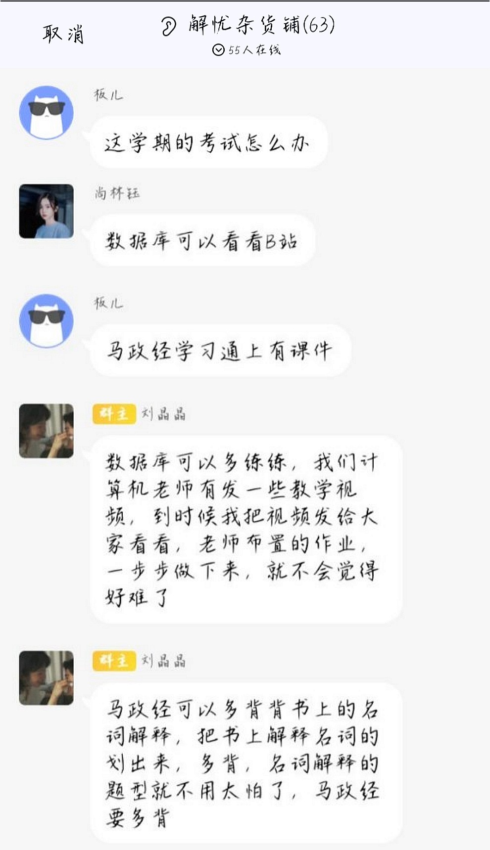 本次活动采用线上形式开展。首先,刘晶晶创建名为“解忧杂货铺”的QQ群并在群内向我班同学介绍活动规则,她表示,同学们可以利用匿名的方式提出自己的问题,其他同学根据问题内容进行实名解答。接着,同学们主要围绕学习、生活和情感三个方面积极提出问题并踊跃回答。其中,刘晶晶多次参与问答互动,为大家提出有益建议。在学习方面,她针对课程内容建议同学们多背诵、积累,上课注意听讲,课后认真完成老师布置的作业。同时,她为大家提供相关的教学视频和学习资料,帮助学生学习与备考。在生活和情感方面,她表示,同学们要正确处理生活与情感问题,树立正确的恋爱观。此外,她还关注生活小事,结合自身经验为大家推荐电蚊香液以预防蚊虫叮咬。最后,副班长孙雪根据同学们的回答质量和次数并参考我班学生的投票情况,推选刘晶晶为“最佳知心朋友”。