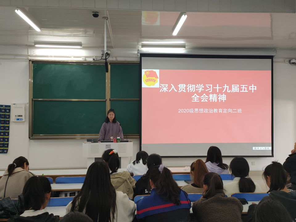 11月19日,德赢AC米兰官网2020级思想政治教育定向二班学习贯彻党的十九届五中全会精神主题团课在社科楼514教室顺利开展。团课由团支书李晨曦主持。