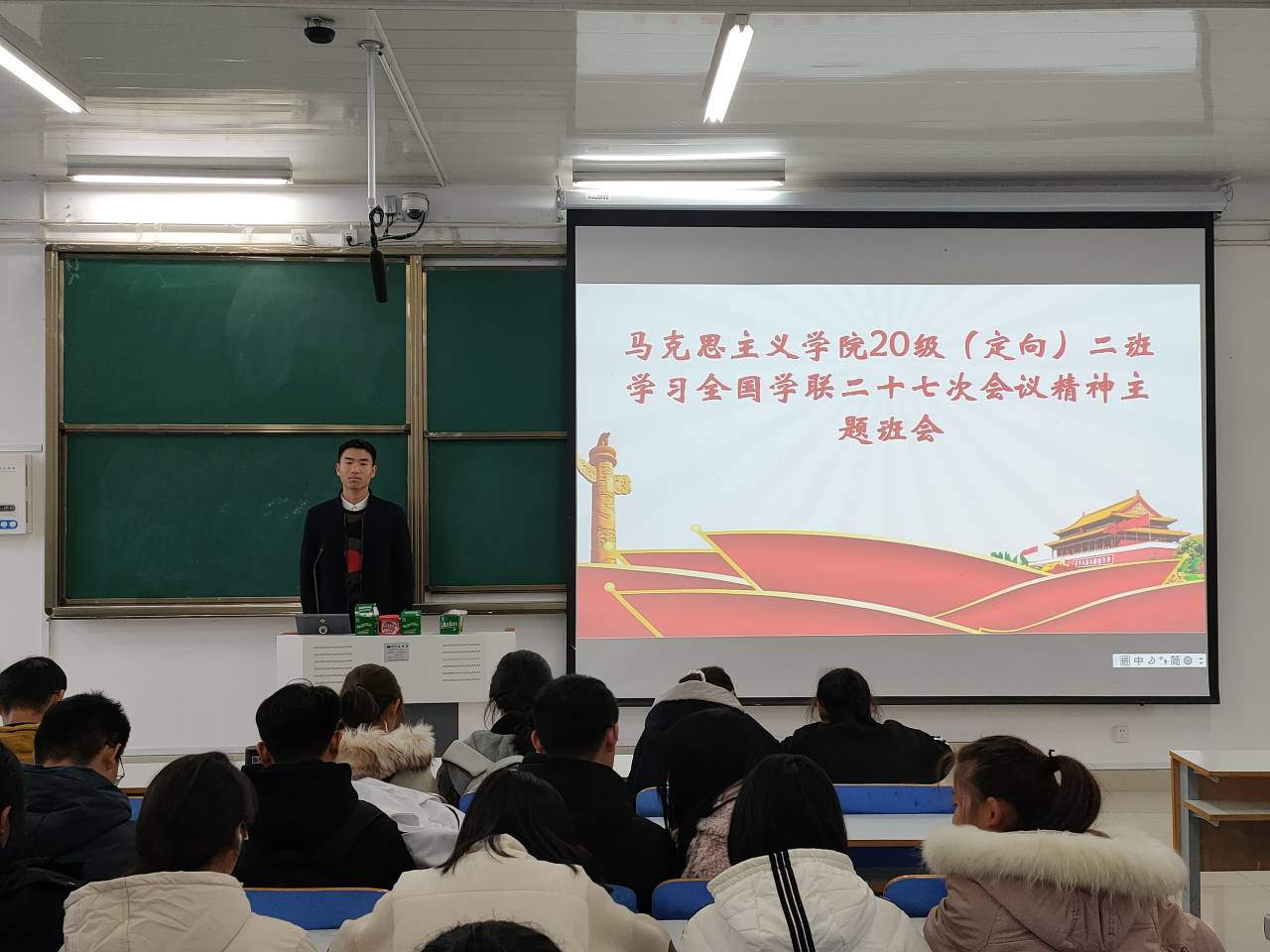 11月24日,德赢AC米兰官网2020级思想政治教育定向二班学习全国学联二十七次会议精神主题班会在社科楼514教室顺利开展。定向二班全体同学参与此次班会。班会由高红凯主持。
